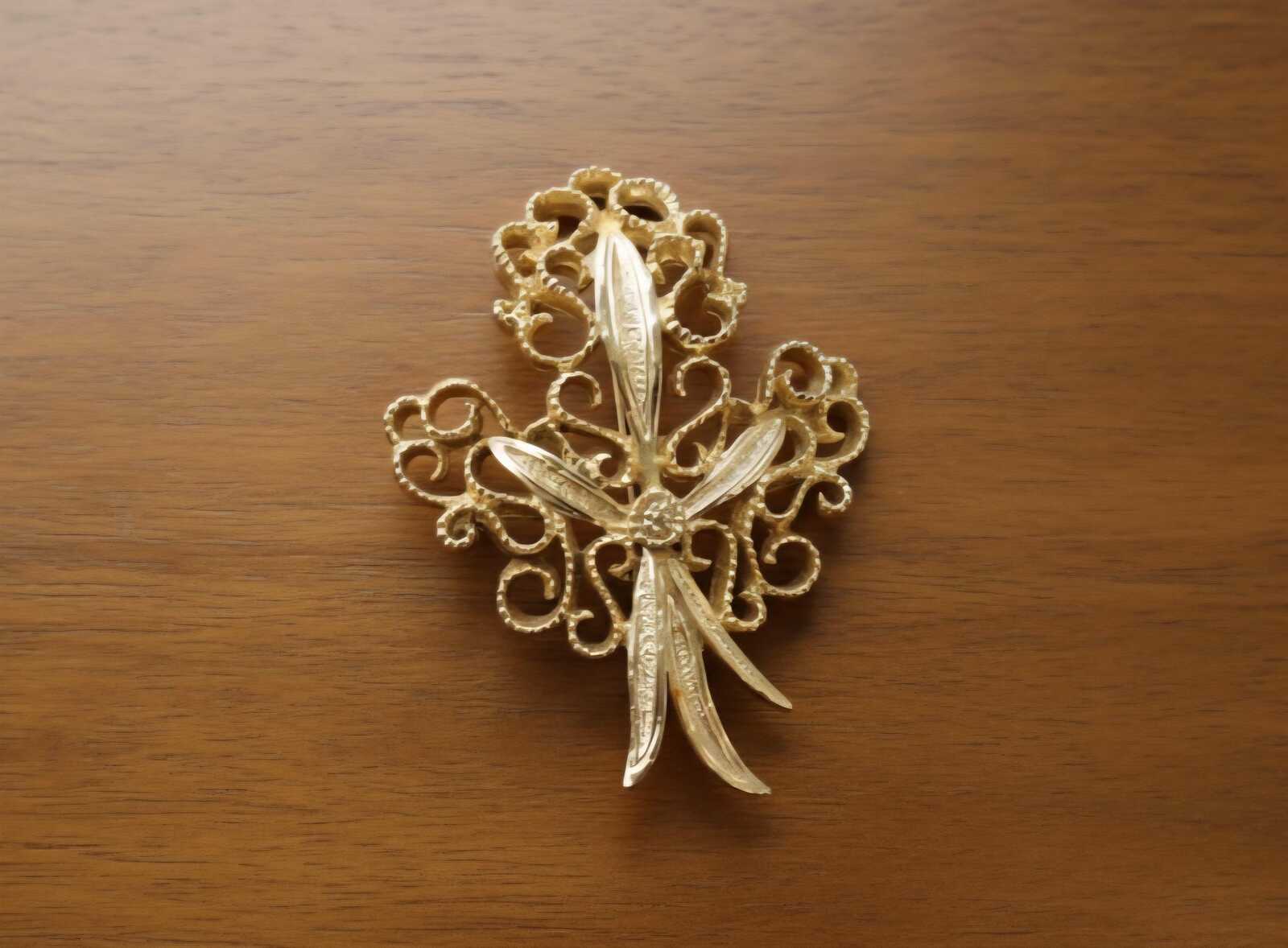?Style/Features: classic roll clasp, straight pin, milgrain, textured and shiny gold stylized fleur-de-lis motif, solid cast metal, substantial quality brooch