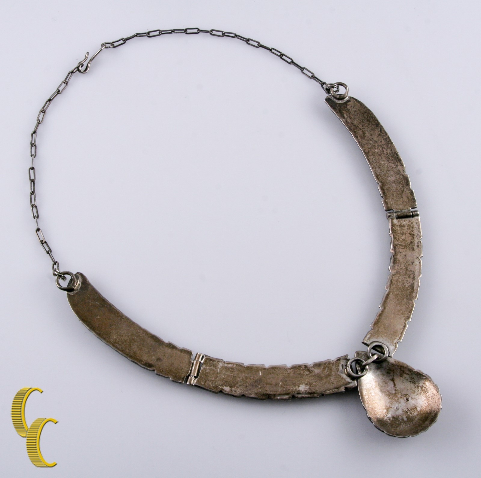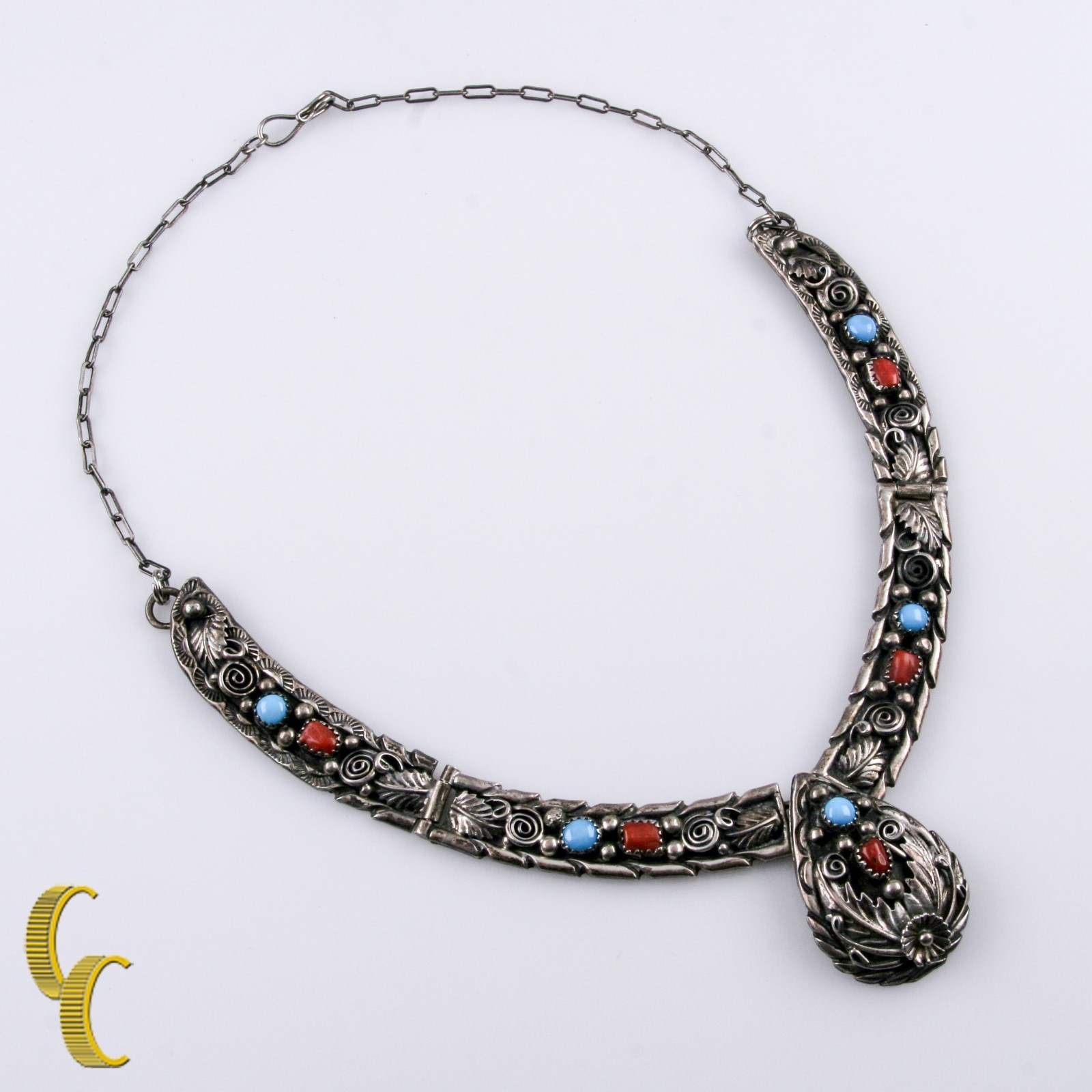 Signiertes H -Sterling Silber Panel Halskette mit türkis- und Korallensteinen