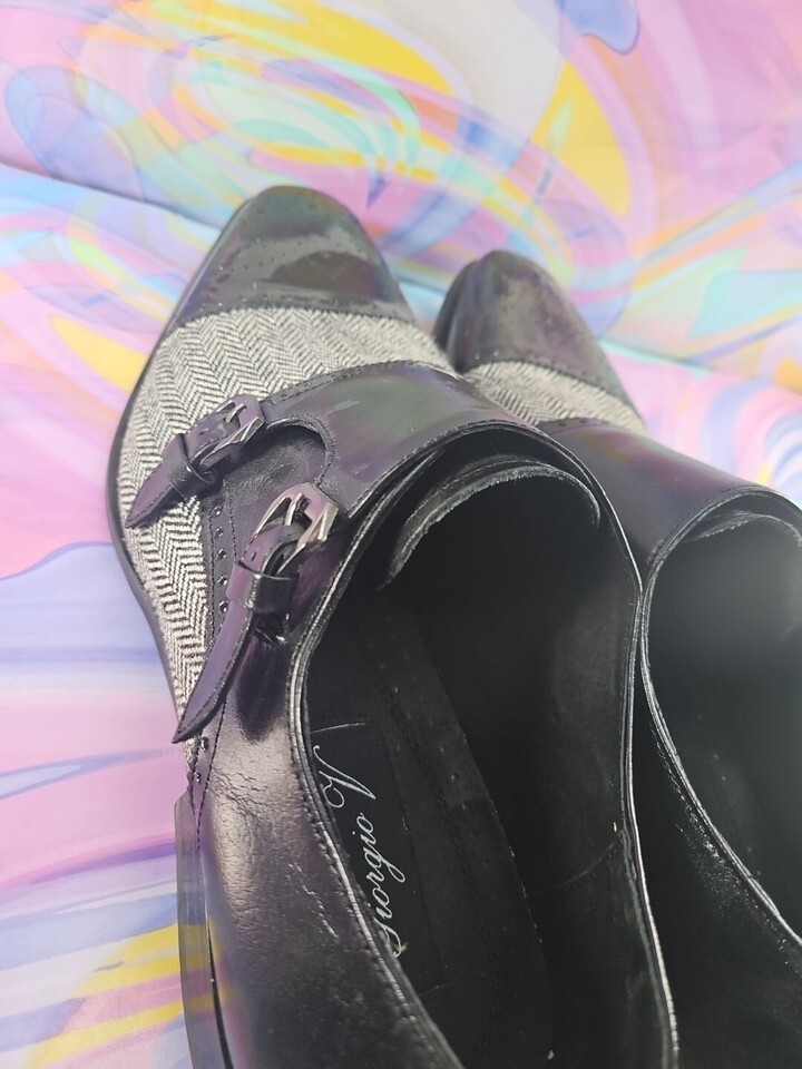 - Giorgio V. Men's Sq. Toe Leather Tweed Upper Black Dress Shoes, Buckle, Sz 12