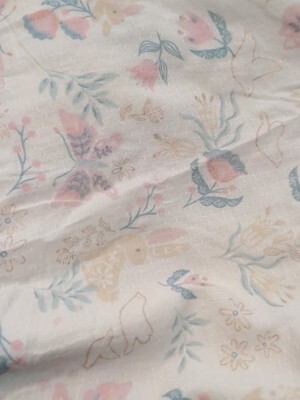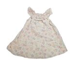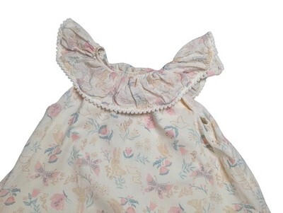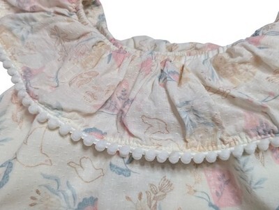 This is an absolutely gorgeous little girl Cynthia rally sundress size 5T. Fits approximately 4 to 5 years old. Fully lined interior. Cream color background with pink sage green tan and gold accents. Features, flowers, birds, bunnies and butterflies. Such a cute and fun print. Beautiful ruffled at the neck and shoulders. The stress is in excellent condition!