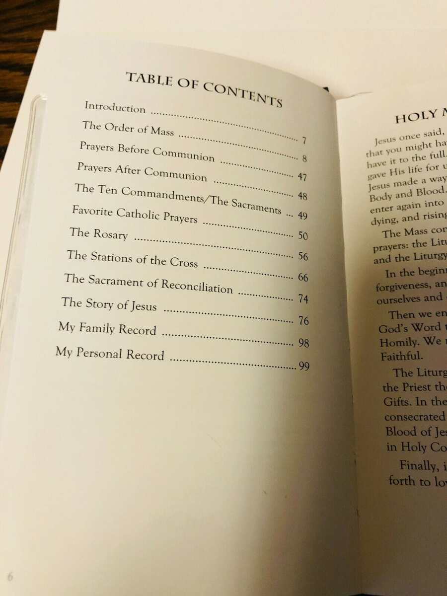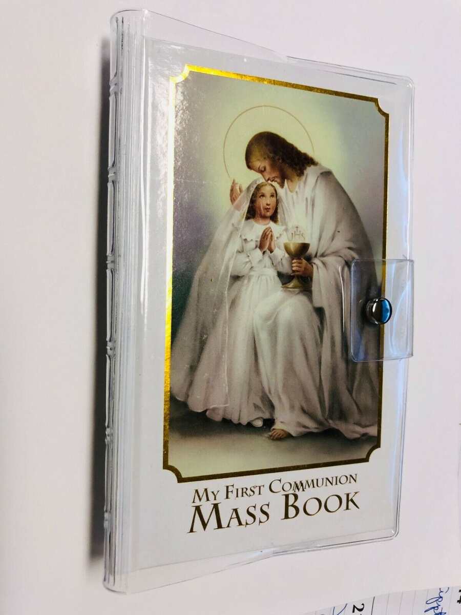 You are purchasing a beautiful first holy communion gift set for a boy or girl. It comes with the mass 97 pages book ( 5.5" x 4"), rosary, scapular, lapel pin and a clear plastic case that holds the mass book, containes a little side pouch to place the rosary. We have a boy and girl's gift set. Please see the pictures I've tried to take as many pictures possible to show details, some will have the glare because of the camera.