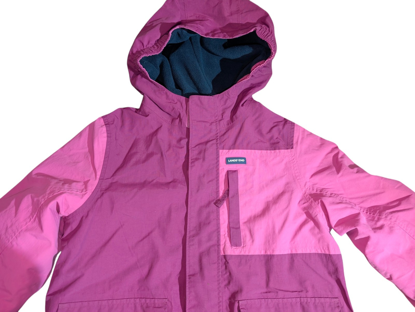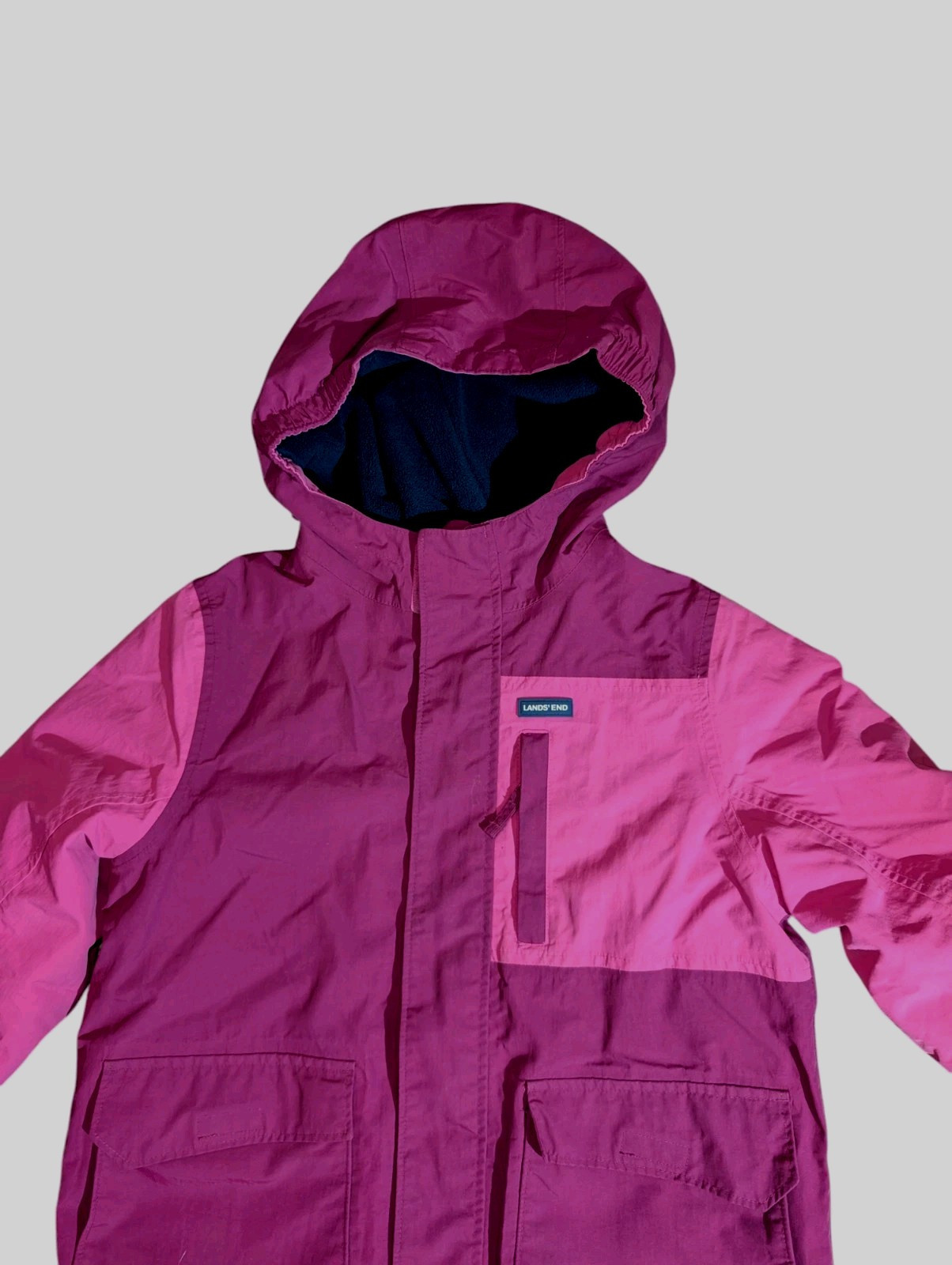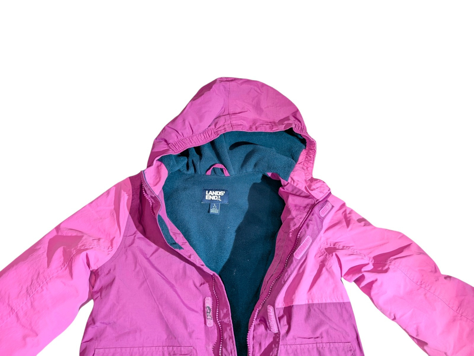 This is a girl's Lands and hooded winter coat/ jacket. Size large 10/12. Beautiful dual shades of pink. Fleece wrist Gators. Fleece interior. Attached. Hood. Zippered front Pocket. Adjustable wrist. This jacket is in excellent condition. However, on the name tag inside someone did try to write their name And it was blocked out with a sharpie.
