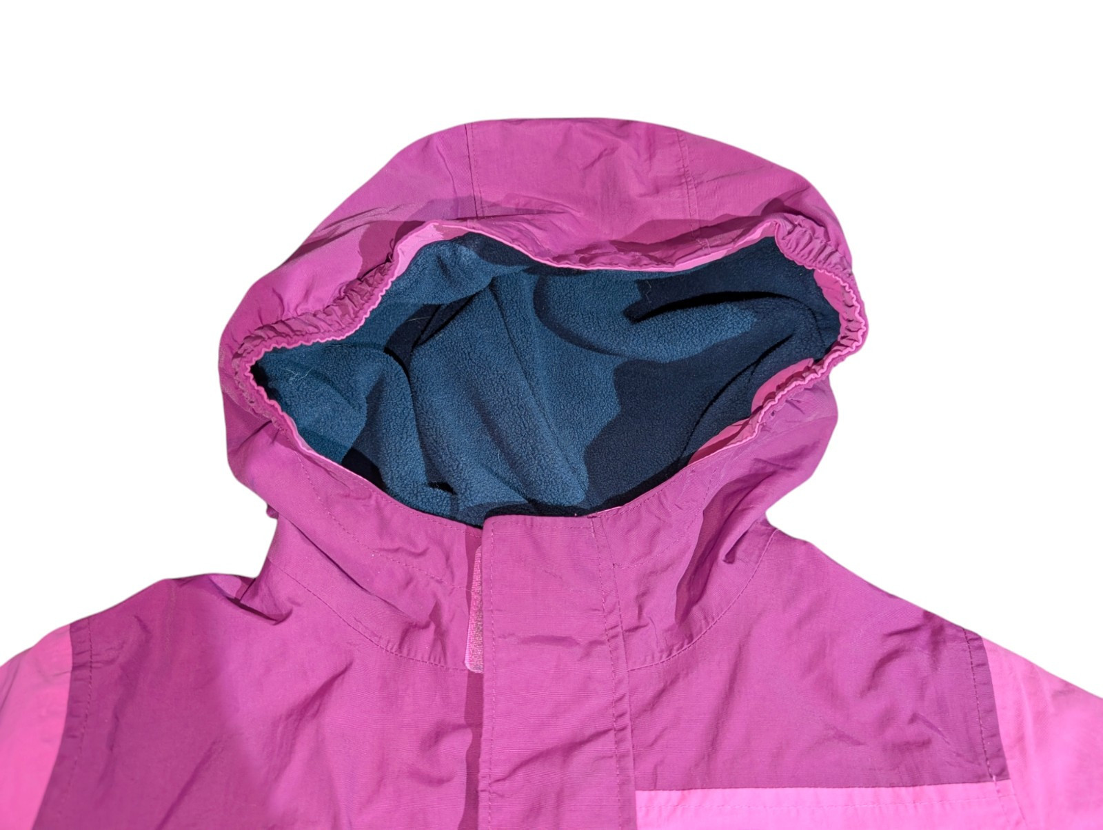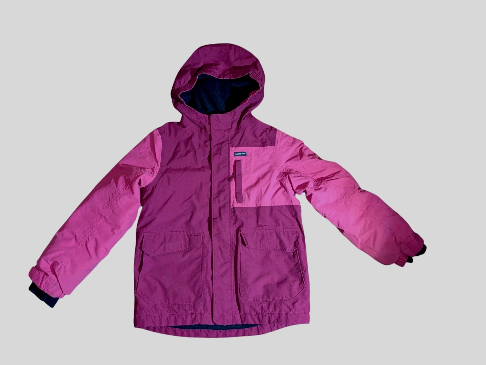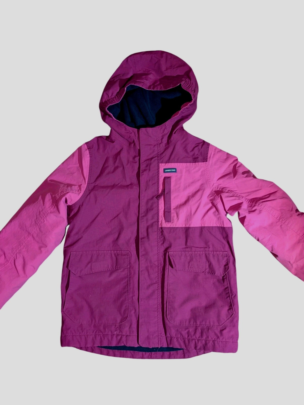 This is a girl's Lands and hooded winter coat/ jacket. Size large 10/12. Beautiful dual shades of pink. Fleece wrist Gators. Fleece interior. Attached. Hood. Zippered front Pocket. Adjustable wrist. This jacket is in excellent condition. However, on the name tag inside someone did try to write their name And it was blocked out with a sharpie.