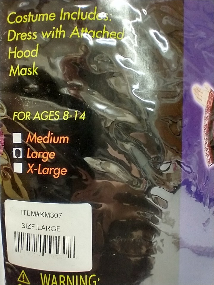 NOTE: Listing is for items listed as included only. Some accessories may be pictured but are not included. All are new in package. Costumes may have some wrinkles or creases from being folded or in package, please see care instructions before trying to iron, etc. A quick and easy way to help eliminate wrinkles is by using a spray bottle form of fabric wrinkle releaser (not included). New in package items may have long / loose threads or strings that may require trimming, these are not considered defects. For Costumes, please refer to chart in this listing as reference for estimating size, always choose a size larger if borderline. Individual results will vary. Please note everyone's body is made different and costumes may not fit as they fit the models in the photos. If you are unsure of the size you need or if your in between sizes, please choose the larger size. These are costumes and should fit comfortably. All sizing information is provided by manufacturer in U.S. sizes. International buyers please know size conversions for your country. International buyers purchase sized items at their own risk. Some Features, Packaging, Colors and Texture may vary slightly. Manufacturer may change some Features, Packaging, Colors and Textures so actual costume may vary slightly from picture. Any known differences will be stated in description. No Returns or Exchanges on Costumes. As is New in Package. Exact colors cannot be guaranteed. Monitors and screens display colors differently, please keep this in mind. I have no way of knowing what you are seeing.