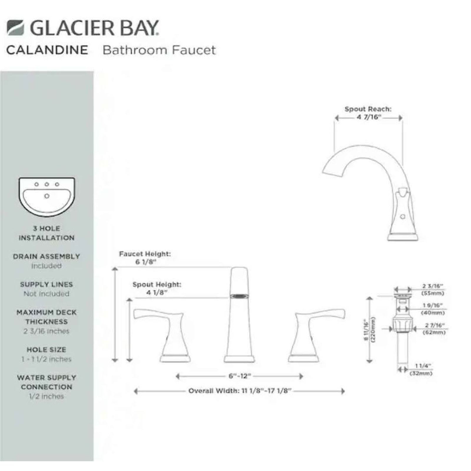 New open box Glacier Bay Calandine bathroom faucet. Never installed. All parts included: faucet body, hot and cold handles, push-down drain, and mounting hardware.