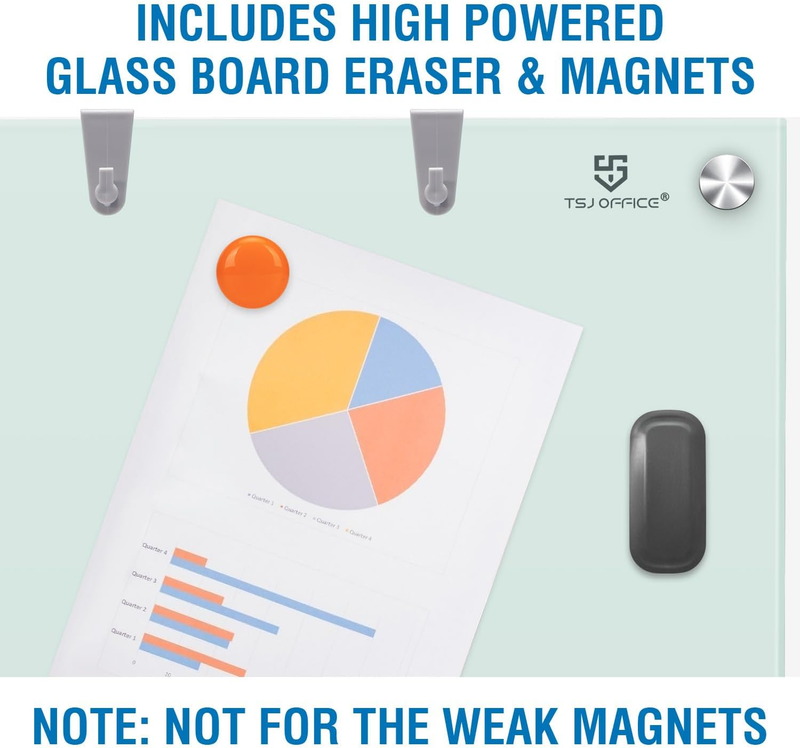 MAGNETIC GLASS WHITEBOARD - Our glass white board comes with a multifunctional steel-backed magnetic glass and 4 high-power glass board magnets. Making this glass whiteboard perfect for meetings and presentations. (NOTE: The magnetism will not be strong due to the thickness of the glass, standard magnets do not work. The eraser is not magnetic.)