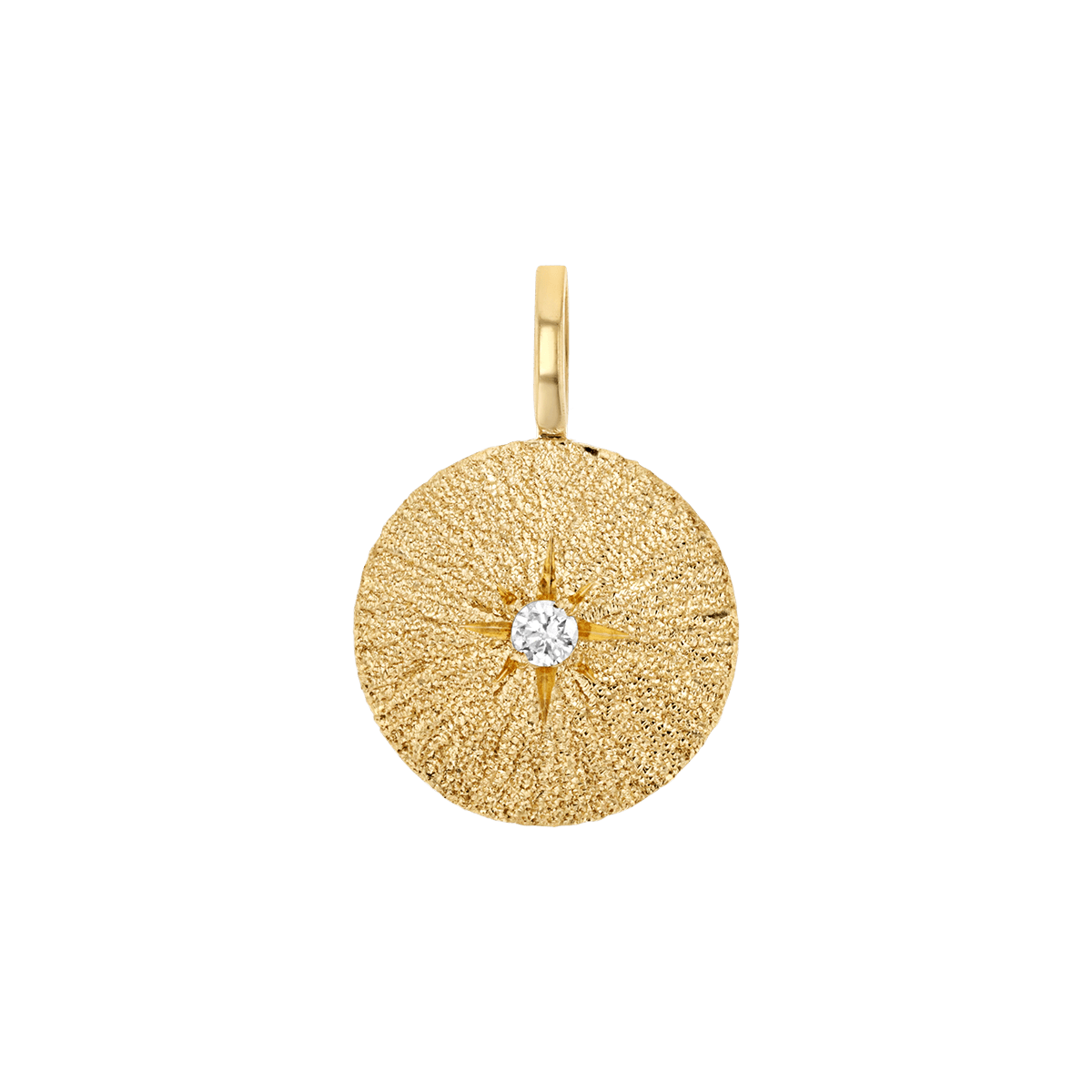 Introducing our Glimmer Birthstone Charm, an incredibly stylish combination of a classic birthstone and a modern disc charm. This 14k Textured Gold with an expertly set center stone, lends itself to the perfect piece to commemorate a special birth. Each stone is beautifully Star-set in the center. Wearing your birthstone is thought to bring wellness and good fortune.