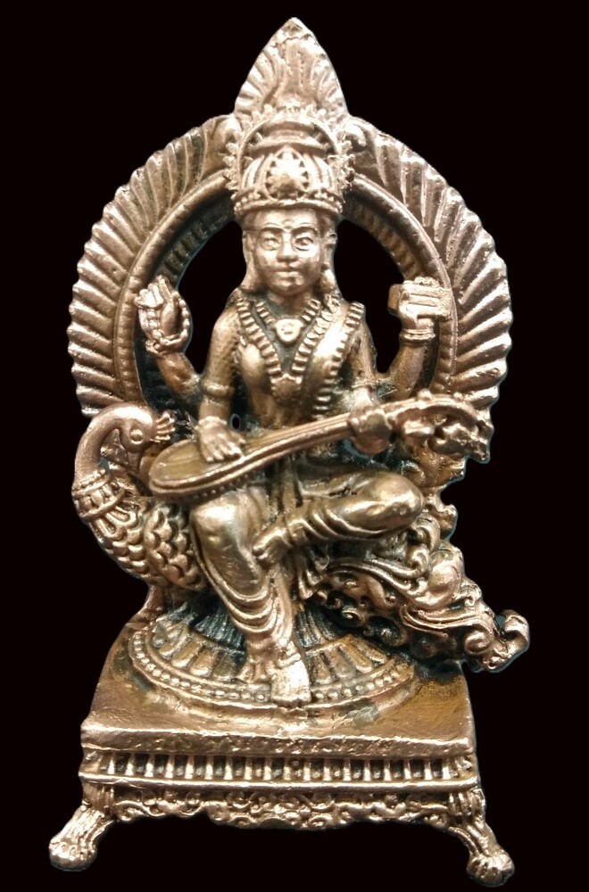 Product Name : Goddess Saraswati Idol In Pure Solid Copper Weight : 175 gms Dimension : 3 inches (Height) * 1.5 inches (Base) Design : Beautiful Goddess Saraswati idol made in Pure solid Copper is artistically crafted in solid copper by skilled artisans of South India. Description : Saraswati is the consort of Lord Brahma and possesses the powers of speech , wisdom and learning . She has sitted on designer peacock , with four hands represents four aspects of human personality in learning : mind , intellect , alertness and ego . She has sacred scriptures in one hand and rosary in other hand , with other two hands she plays the music of love and life on the musical instrument veena .