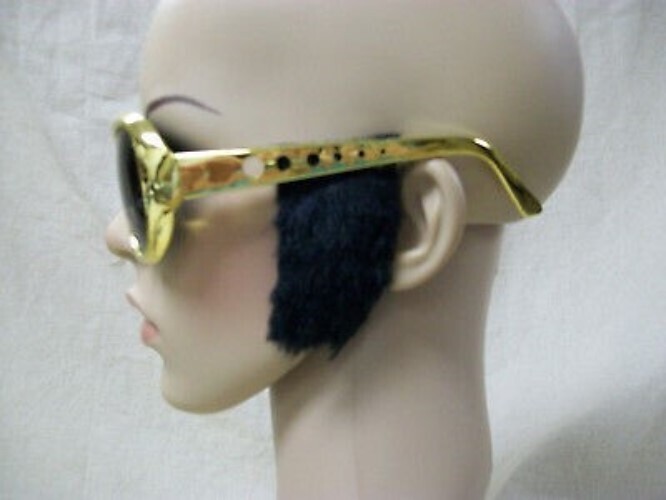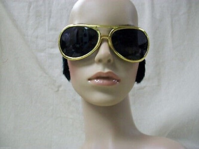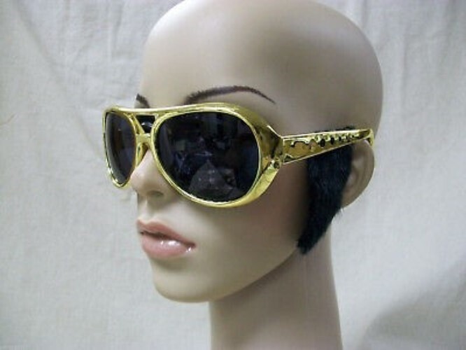 Classic Elvis Style Costume Glasses. Have Fake Black furry like sideburns attached. The frame is gold, the lens are smoke shaded. Lens do not provide UV Protection and are for fun wear only. Not mean't for sun protection. These are great to accent your Elvis costume or wear to a concert. One size fits most. Novelty Sunglasses for cosmetic use. Does not provide any vision correction. Unisex: Male or Female. May have some slight excess glue visible in sideburn area.
