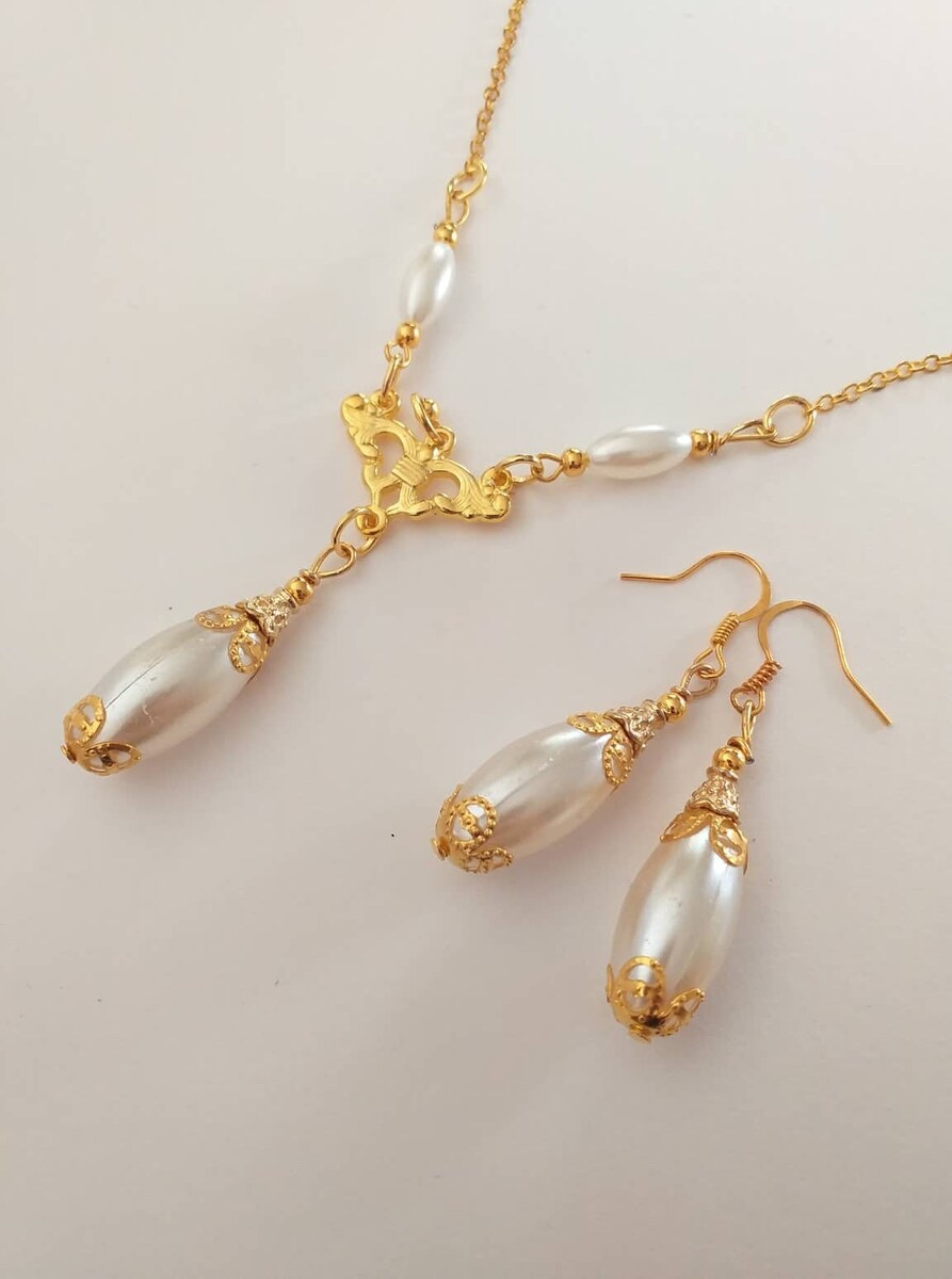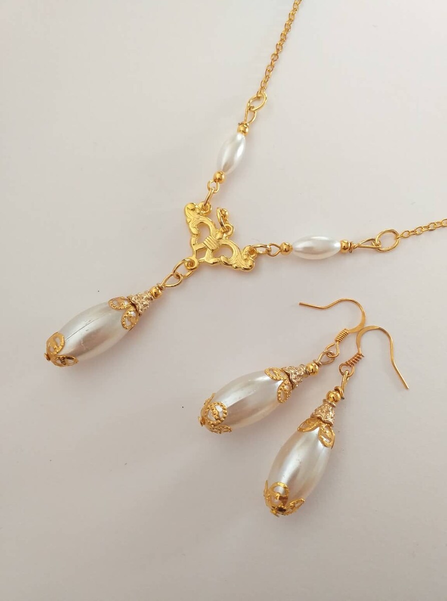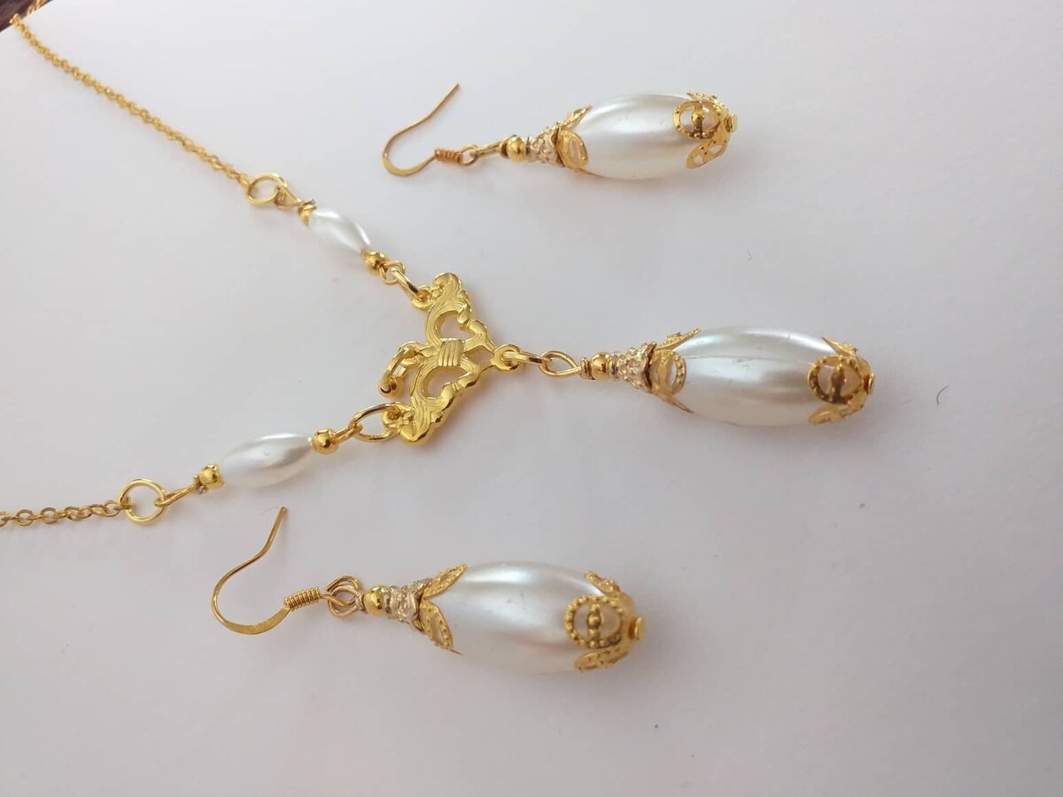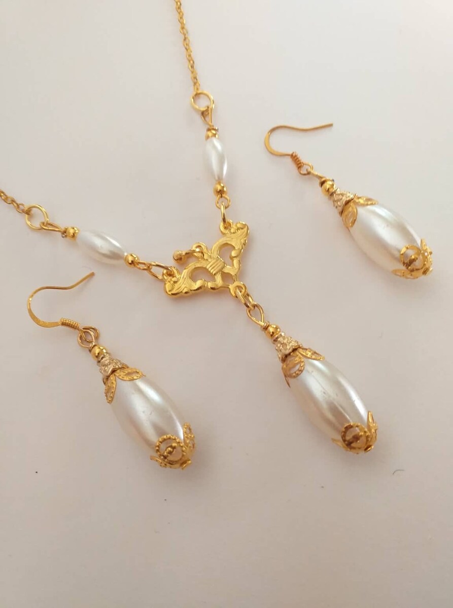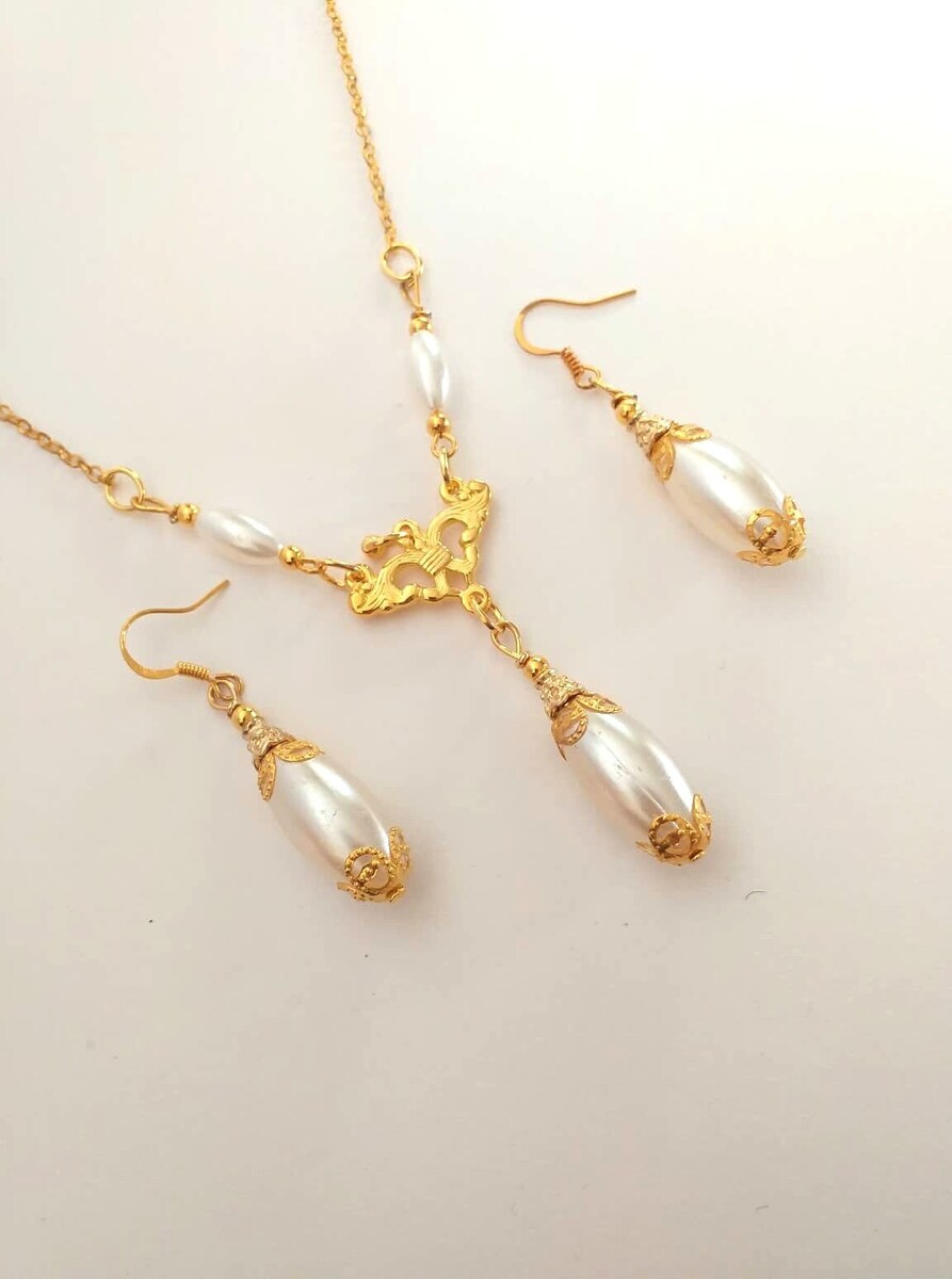Beautiful Set of gold tone filigree ornaments and white pearl acrylic oval beads pendant necklace and earrings. Antique style filigree gold tone set necklace and earrings . Gold tone oval plastic pearls Edwardian style necklace and earrings . Boho necklace . Boho jewelry set . Boho pearl earrings . Bohemian necklace and earrings . Birthday set necklace and earrings . Gold-tone antique style jewelry set . Bridal jewelry set. Jewelry set for wedding. Birthday gift set.