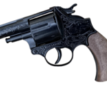 This cap-firing, police-style revolver features realistic action, accurate filigree stamping detail, and durable construction. Release the catch to open the cylinder, load 12 Shot Ring Caps (not included) on to the cylinder and close to fire, just like the real thing!