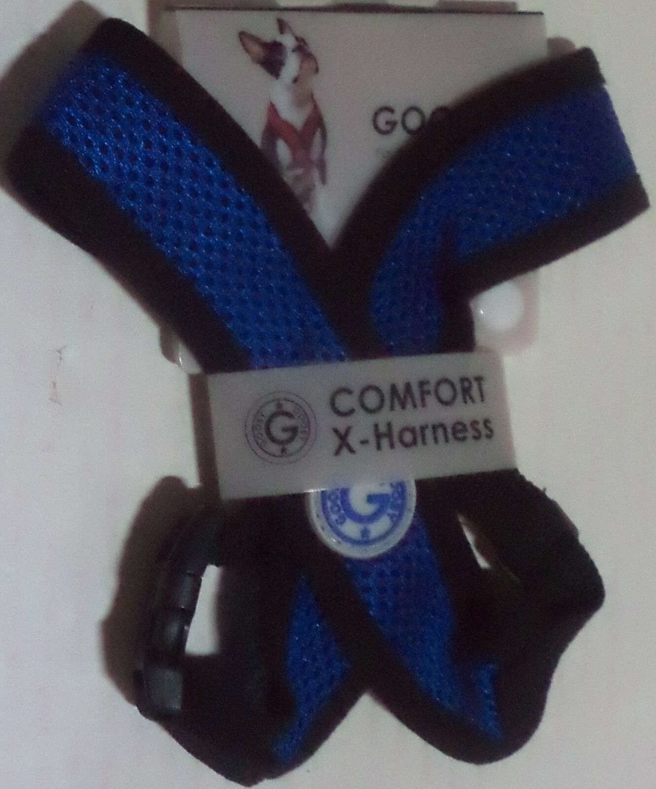 You are Buying One Brand New Gooby Fully adjustable Choke Free Comfort X Soft Harness, Blue Black Size Small - Large description Gooby's original X frame harness has the functionality without compromising the style. Comfort X Harness creates an V neck opening that puts the force around the chest instead of the neck. It also has a micro suede trimming around the harness to minimize abrasion. With modern X design, protect your pup from injuries. Try Comfort X Harness. Micro seude trimming Machine washable; Air dry recommended Patent pending choke free X-Frame Lightweight directions Machine washable; Air dry recommended