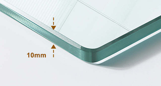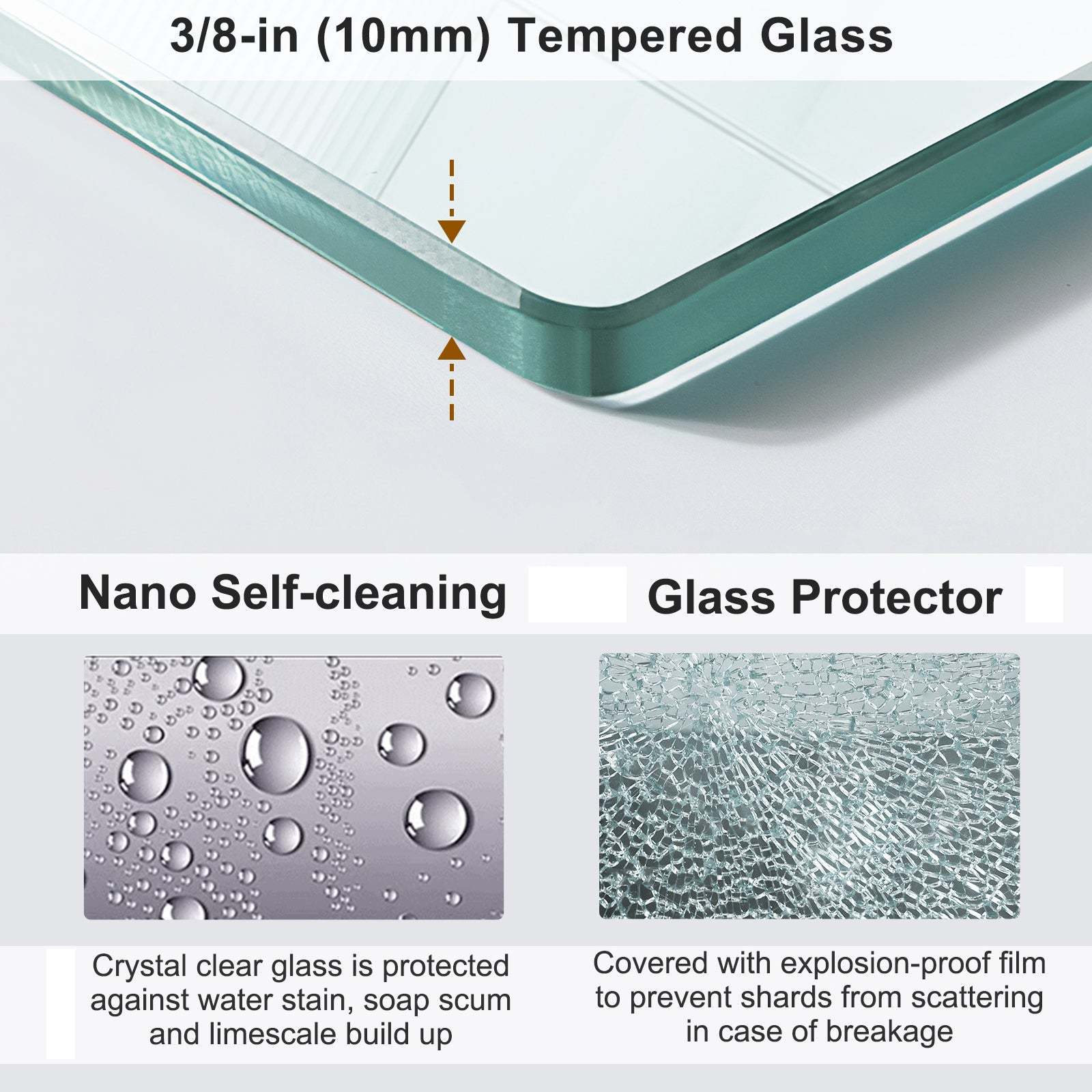 SAFE DURABLE: The clear tempered glass is 3/8' thick. The glass is also coated with a Nano Technology protective layer, making it easy to clean and resistant to stains and scratches. The stainless steel hardware is made of high-quality materials and is corrosion-resistant, ensuring long-lasting durability.