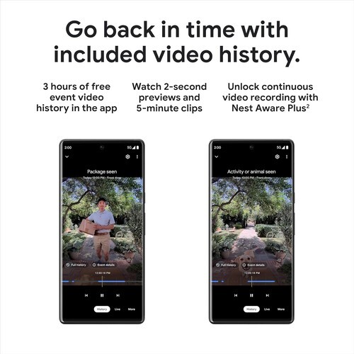 * See what you missed with 3 hours of free event video history included in the Google Home app; watch 2-second previews and 5-minute clips of important activity