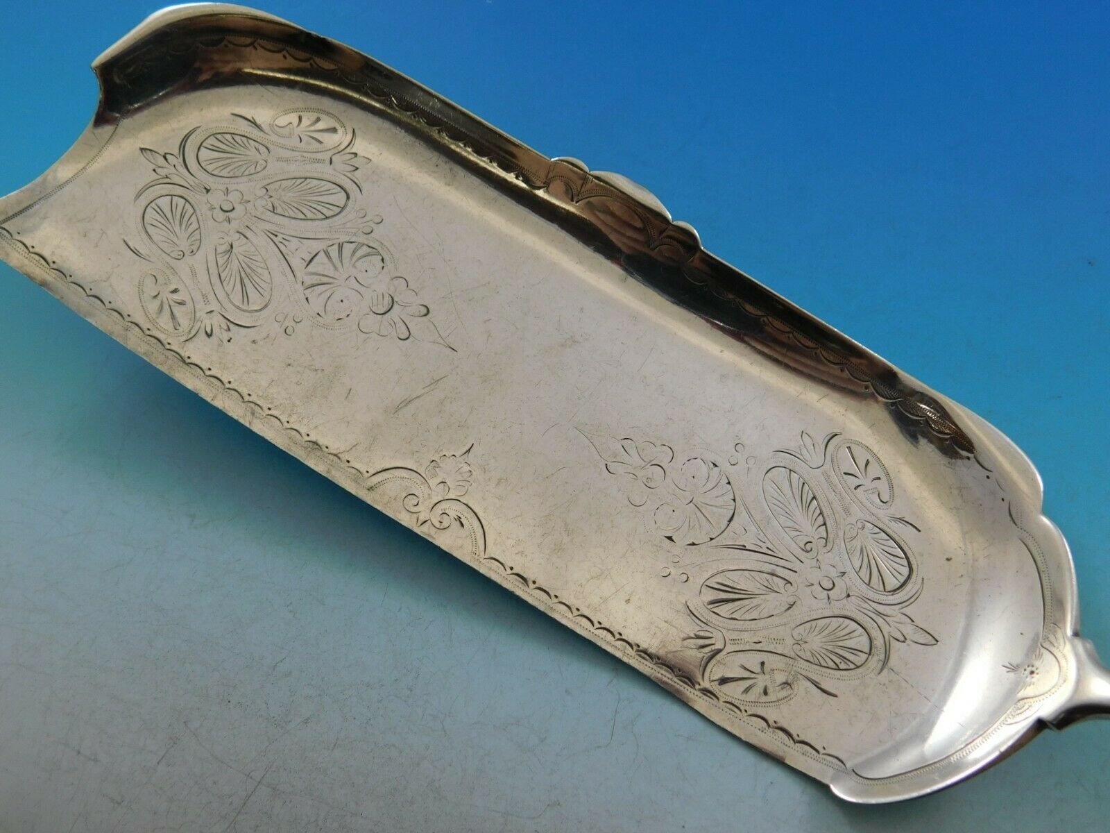 Extraordinary sterling silver Crumber measuring 13" by Gorham (Art Silver circa 1865). This piece features an impressive three dimensional beetle at the end of the handle with great detail. The blade has lovely bright-cut detailing. It is monogrammed (see photo) and is in excellent condition.