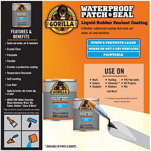 Gorilla Waterproof Patch Seal Liquid is a flexible, rubberized coating that seals out water, air and moisture. Before applying, stir contents for 30 seconds until it is thoroughly mixed. It can be applied by brush, roll, trowel, dip or pouring. Ensure the surface is completely covered. Once applied, the self leveling formula smoothly covers small gaps and cracks ensuring a watertight seal. When dried, Gorilla Waterproof Patch Seal Liquid is paintable and temperature/UV resistant resulting in lasting repairs! Not for continuous submersion or below-waterline use.GREAT FOR: Metal, Concrete, Wood, Aluminum, Brick, Tile, Fabric, Rubber**, Glass and More!*For exterior use only. Not intended for inside of firebox or chimney stack. **May not work for all types of plastics and rubbersDIRECTIONS: 1) Clean surface of dirt, dust, grease and oil. Make sure surface is dried completely. 2) Stir contents for 30 seconds until it is thoroughly mixed. 3) Apply to surface by brush, roll, trowel, dip or pour. Ensure surface is completely covered. 4) Apply multiple coats to ensure all cracks and holes have been filled. Allow to cure in between coats and before water exposure. Full cure at 24-48 hours.NOTE: Test finished project with light water exposure to ensure all cracks have been filled. If test fails, apply additional coats. Do not use for gaps larger than 1/4". Apply between 50F and 120FCLEAN UP: Wipe up any unwanted material with a dry cloth or paper towel immediately. Use mineral spirits to clean applicators such as brushes and rollers.STORAGE: Remove excess product from top of can with a dry cloth. Press or lightly tap lid shut to create tight seal.PAINTING: Works with both latex and oil based paints. When coating with oil based paints, use a primer first before painting