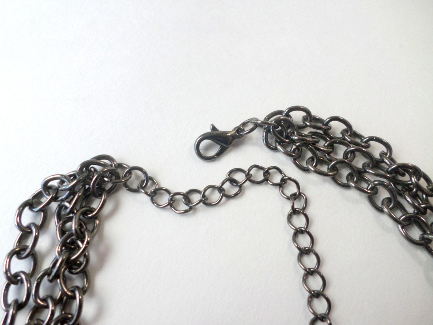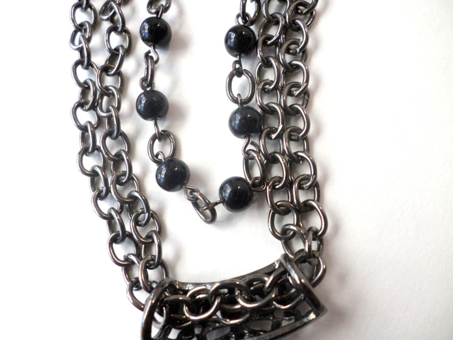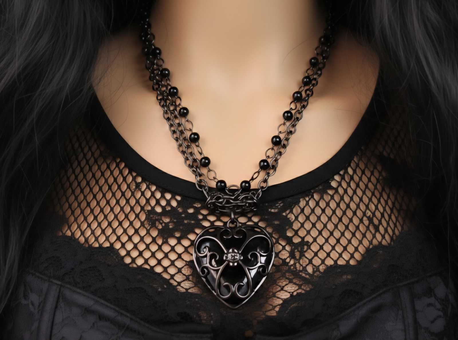 ?Style/Features: Black solid lucite caged heart pendant, 2 gunmetal chains, 1 heart-matching black bead chain, 80s goth meets punk