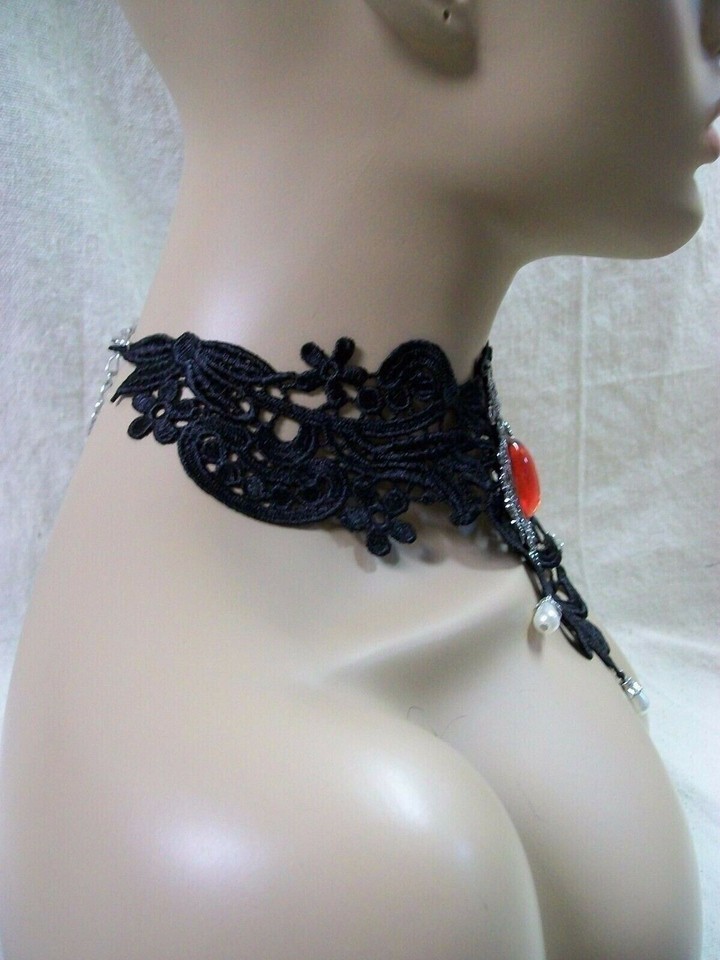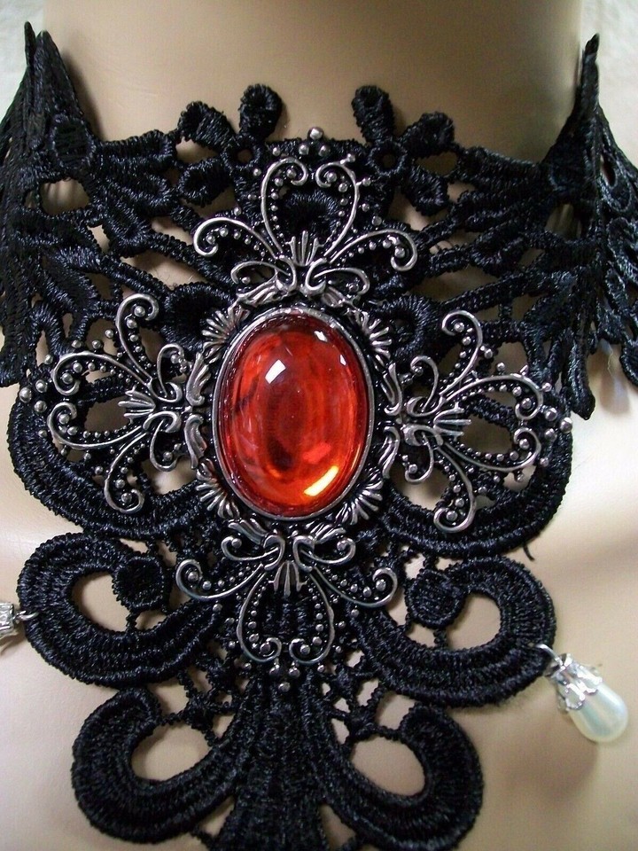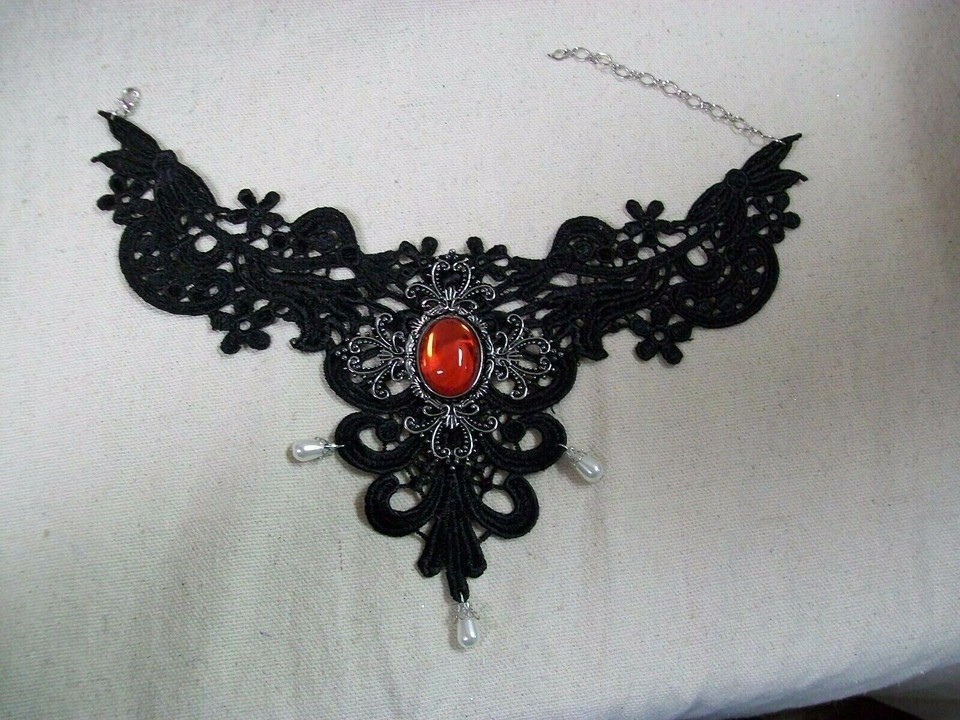 Fancy Delicate Crochet like Lace Costume Choker. Accented with a Red Jeweled Medallion in the center with dangling faux teardrop pearls in front. For Adult Use. One size fits most. Choker has silver chain in back with a lobster claw like clasp. Choker is Delicate tugging or pulling can cause the lace to tear apart. Great for themed costumes: Renaissance, Medieval, Victorian, Steampunk, Edwardian, Civil War Era, Gothic, Vampire, Old Western Saloon, Wild West Showgirl, Madame, etc
