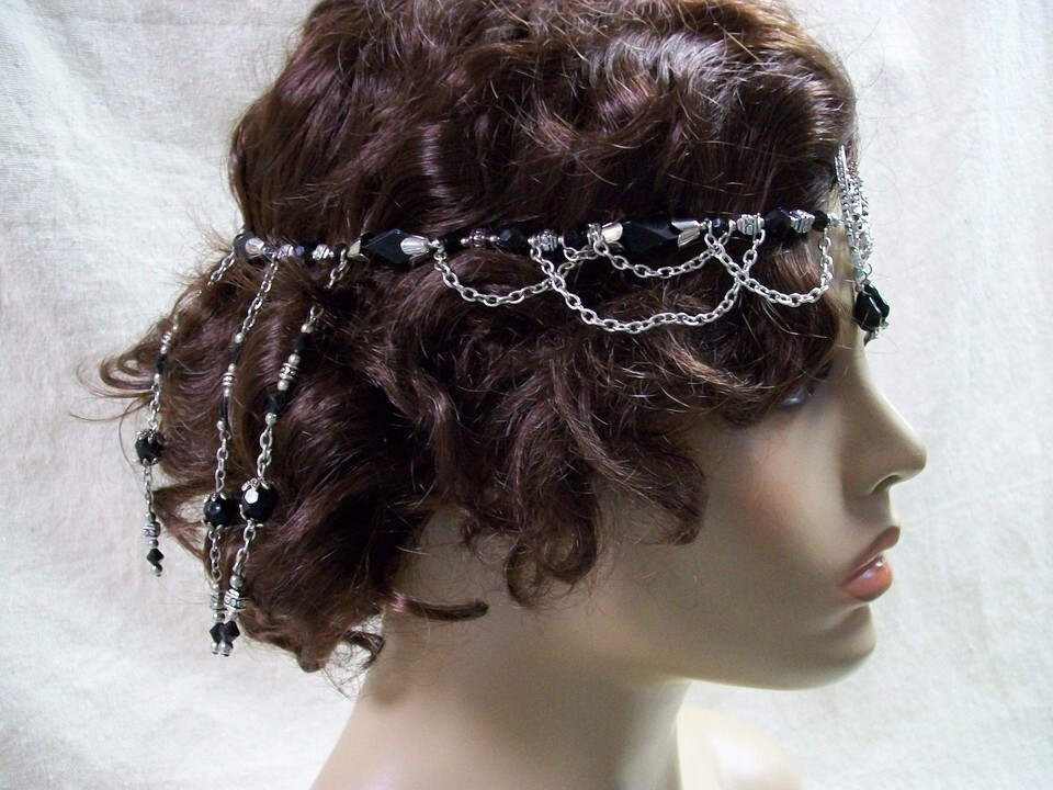 Antiqued Silver Tone with Onyx (Black) beads with a crescent moon in center. Has strands dangling on one side kinda toward the back. This is a bit larger probably for a draped look, It wouldn't fit on my mannequin without the wig. It's a fixed size, No adjustment. I measured it at approx. 22.5". Adult: One size fits Most. DOES NOT INCLUDE MANNEQUIN OR WIG/HAIR.