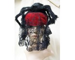 Gothic Spider Costume Hat with Veil. The hat part is red velveteen type fabric in a can shape. The spider is furry black. The spider has bendable legs and will need to be gently shaped as desired. The veil is a black lace with a spider and web design trimmed with a black lace ruffle. The spider may make this hat a little top heavy so pinning with hair pins or bobby pins may be necessary to secure hat in place.