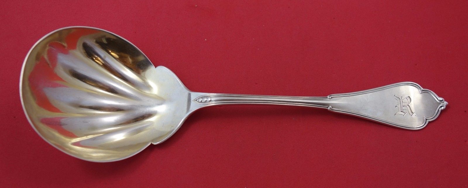 Gothic aka Eureka by Vanderslice sterling silver Berry Spoon Gold Washed with Ridge, 8 1/2". It is monogrammed (monos vary) and is in excellent condition. Rare Early San Francisco California Silver.
