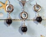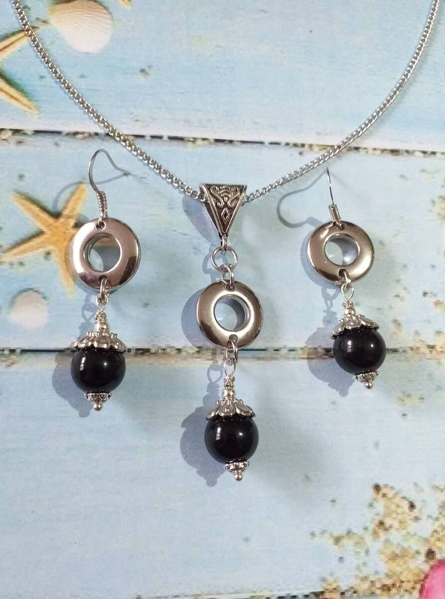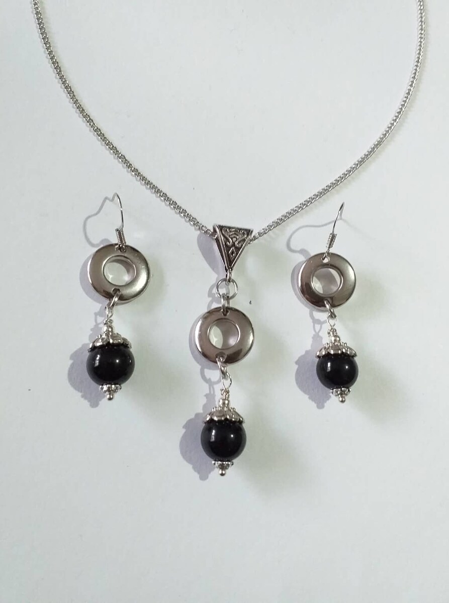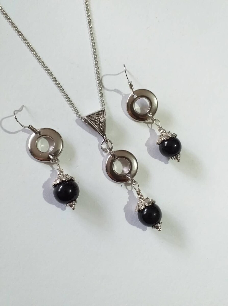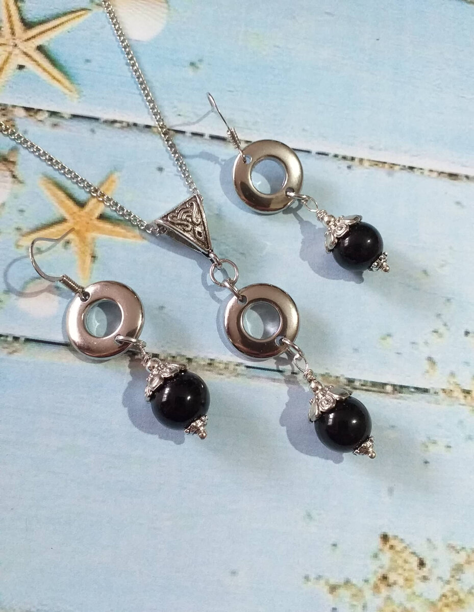- Gothic black Quartz silver jewelry set necklace earrings Silver black Quartz sil