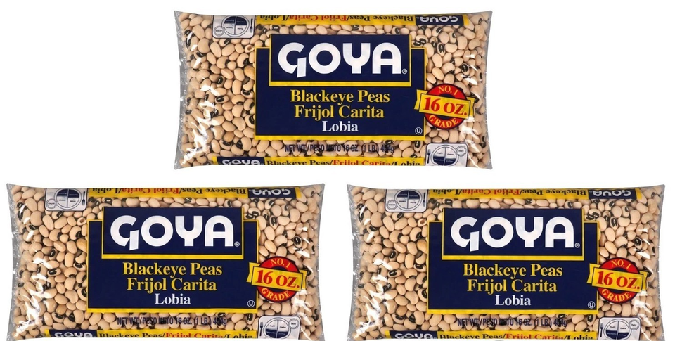 GOYA Blackeye Peas Frijol Carita Lobia Three 1 lb (16 ounce) bags, dried GOYA Blackeye Peas have a delicious flavor and are part of the wide variety of dry beans that GOYA has for you. These tasty peas get a yummy creamy texture once cooked. They are a perfect ingredient to create countless dishes, including recipes with rice and salads. In the southern United States, serving them on New Year?s Day is thought to bring prosperity. They?re also a favorite ingredient to prepare Hoppin? John, a dish made with peas, rice, and pork, and they?re part of the African American tradition of soul food. For a quicker preparation, we recommend soaking them before preparing and ideally cooking them in a pressure cooker or in a slow cooker. Then enjoy their tasty flavor! Also, they?re perfect to add to a vegetarian or vegan diet. You?ll love their flavor! Discover new recipes or enjoy preparing your favorite dishes with GOYA Blackeye Peas. ? Good source of fiber ? Good source of potassium ? Good source of iron ? Low in fat ? No saturated fat ? Cholesterol free ? Very low on sodium ? Vegan ? Kosher ? Size: 16 oz. These are hard to find in stores, especially for New Years!