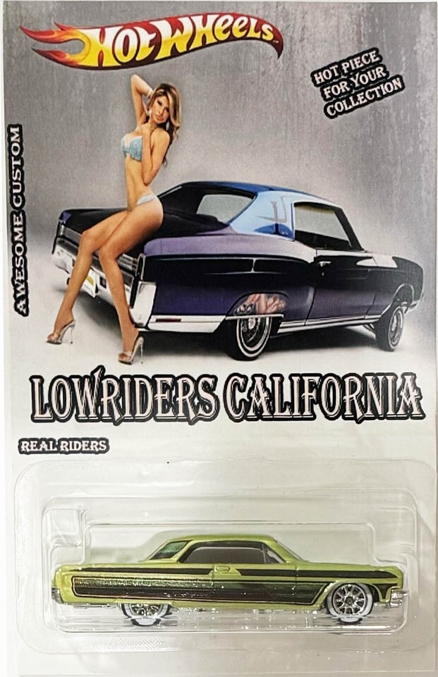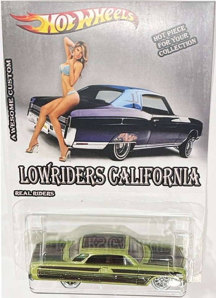 Green '64 CHEVY Impala CUSTOM Hot Wheels Lowriders California Series w/ Chrome Real Riders Rubber Wheels. This is a Customized Hot Wheels Car! * It was removed from the original factory package and striped of its original paint. * Then it was painted, Custom Themed decals applied and clear coated multiple times. * The wheels have been swapped for Real Riders. * The car was put together with a rivet, which looks almost like an original. * Finally, the car was attached with the blister to the custom designed card. * The car will be shipped in plastic case and shipped in a box. * The back of the card is white.
