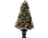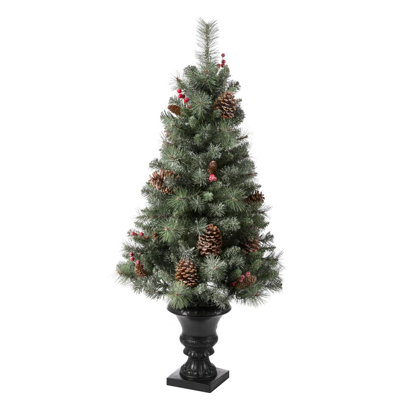 This 4ft/5ft mixed tip Flocked Pine Entrance Pot Tree(set of 2) with decorative urn base is a welcoming addition to doorway, deck, porch or patio. It features snow sprinkled branches and is trimmed with red berries, and pine cones. This tree is pre-lit with 130 warm white lights that remain lit even if a bulb burns out. Display this attractive greenery in any indoor or covered outdoor location.