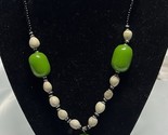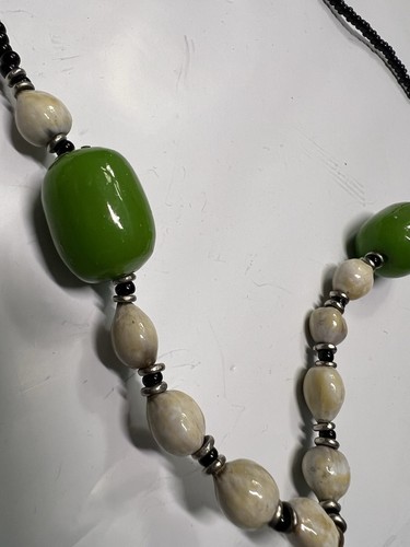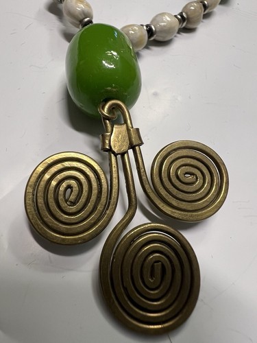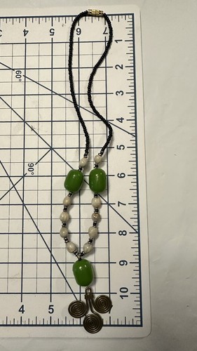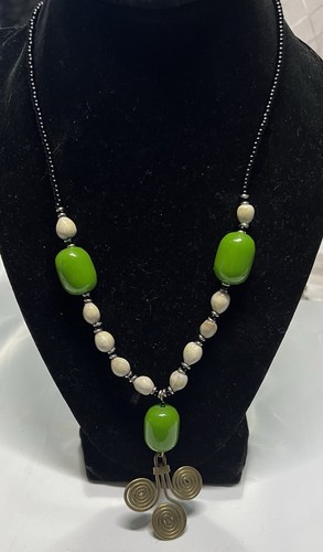 Green, Cream And Black Bead Bronze Color Medallion Pendant 22” Necklace