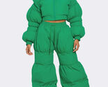 The cropped puffer jacket features exaggerated balloon sleeves and a sleek zip-front closure, making it perfect for layering or standing out on its own. The high-waisted quilted pants complete the set, offering a relaxed yet dramatic silhouette with their oversized design and cushioned fabric that mimics the comfort of your favorite puffer coat.