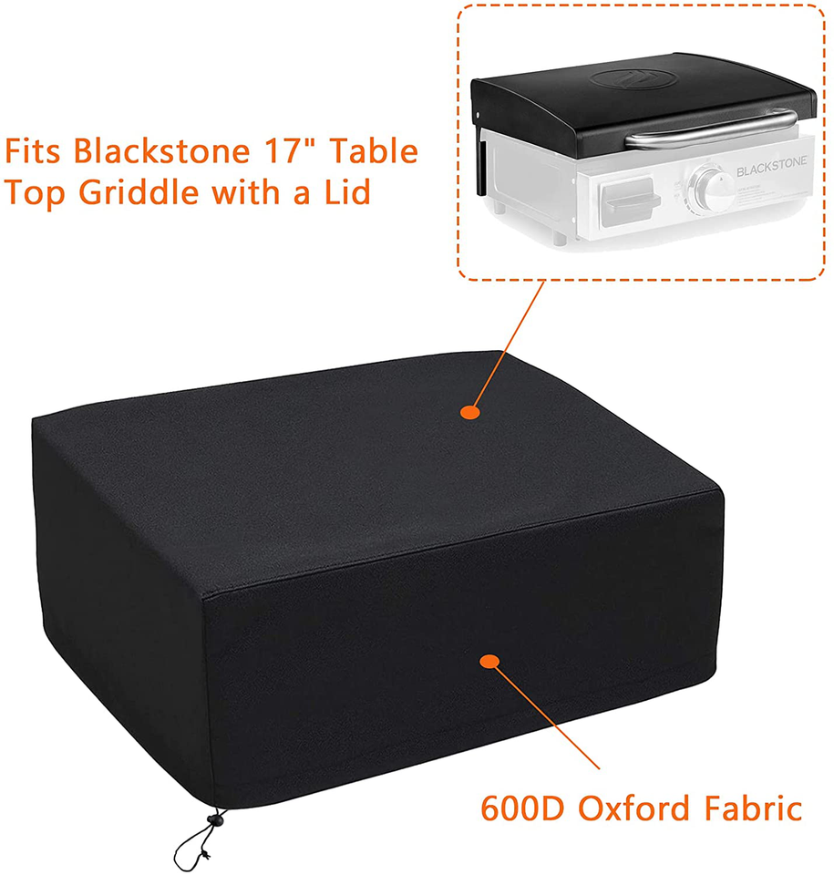 US Warehouse - FREE FAST Shipping in USA Product Description: ?Iterative Design: Optimized size to better fit your 17 inches Blackstone table top griddle with griddle hood. You no longer need to repeatedly remove the lid in order to fit your beloved grill into the original cover. ?This griddle cover is made of heavy duty 600D polyester which offer a tough material against rough weather. Compared to 210D or 420D fabric materials, our grill covers will perfectly to protect the grill from oxidizing rust. ?The drawstring design ensures that the cover is tightly protected on top of your Blackstone 17" griddle (or other similar size grill ) and no one wants the cover to be blown away by high winds. ?You will get 1 Griddle Cover. Griddle Cover for Blackstone 17 inch Table Top Griddle with Griddle Hood ?BQMAX specializes in manufacturing outdoor patio supplies, we provide quality products and a hassle-free shopping experience. Fast response within 24 hours, shop now and know for yourself. Thank You for Shopping!