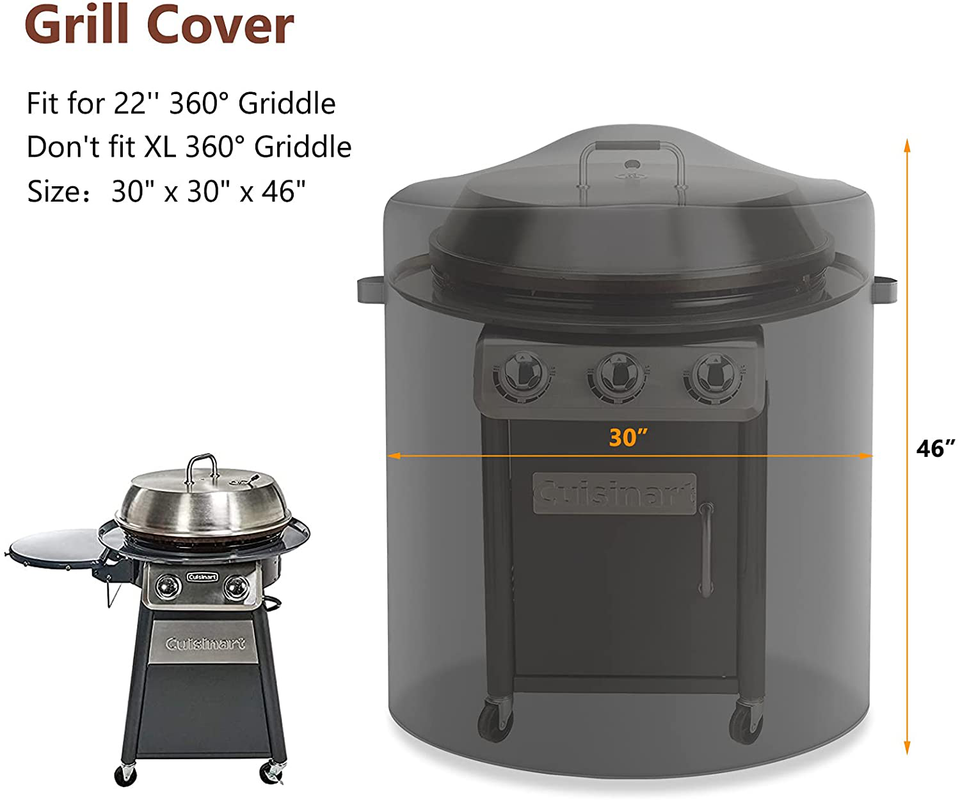 US Warehouse - FREE FAST Shipping in USA Product Description: ??Perfect Fit?This cuisinart 360 griddle cover fits for 22" CGG-888 360 Griddle, Measures 30" x 30" x 46". ??Don't Fit?XL 360 Griddle CGWM-056 ??FadeStop Material?Fade resistant fabric with vinyl coating, water repellent processed, the material exhibits superior colorfastness, resists UV, repels rain, resists tears and cold cracking, durable and long-lasting, gives your grill all year round protection against sun, rain, snow, hail, wind, dust, dirt and etc ??Fastening Straps?4 fastening straps at bottom adjust the cover for a proper fit and keep it from blowing off. ??Convenient Handles?The top handle lets you remove the cover when you're ready to grill, and hang it up for easy storage ??Rip Resistant UV Protection?QuliMetal grill cover have exterior bound seams and high-density stitching for great water resistance and durability. UV resistant design provides exceptional durability to sunlight ??Easy to Clean?The grill cover is easy to use and clean. Simply hose with water and the dirt will disappear soon. Dry up the grill cover in the sun for next use Thank You for Shopping!