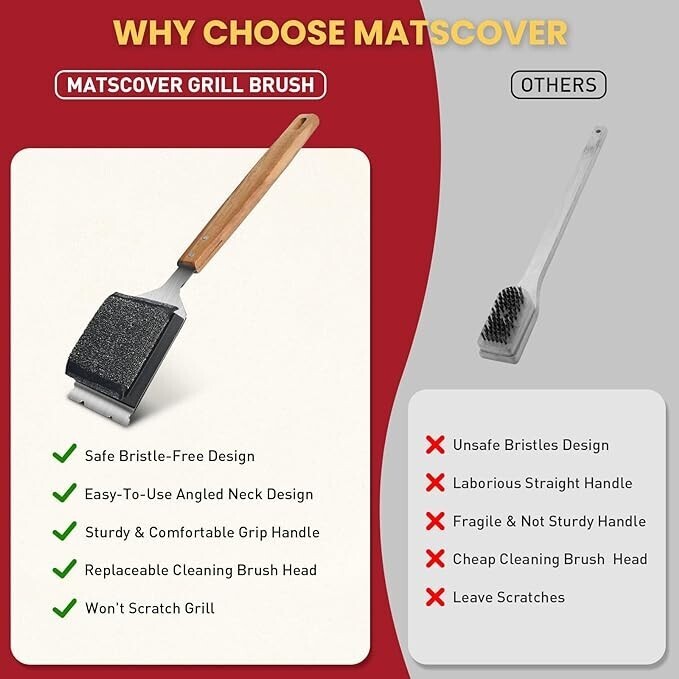 ?[????????-???? ??????] In the design of Matscover, we used a bristle-free cleaning brush head for safer cleaning. You don't have to worry about dangerous wire bristles breaking off and catching on the cooking surface of the grill cleaner brush.