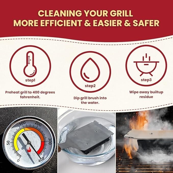 ?[?????-?????? ?????????] Our bbq grill brush is designed for ease of use. Simply place the cold-water-soaked cleaning brush on the preheated 400F grate and wipe back and forth to quickly scrub.