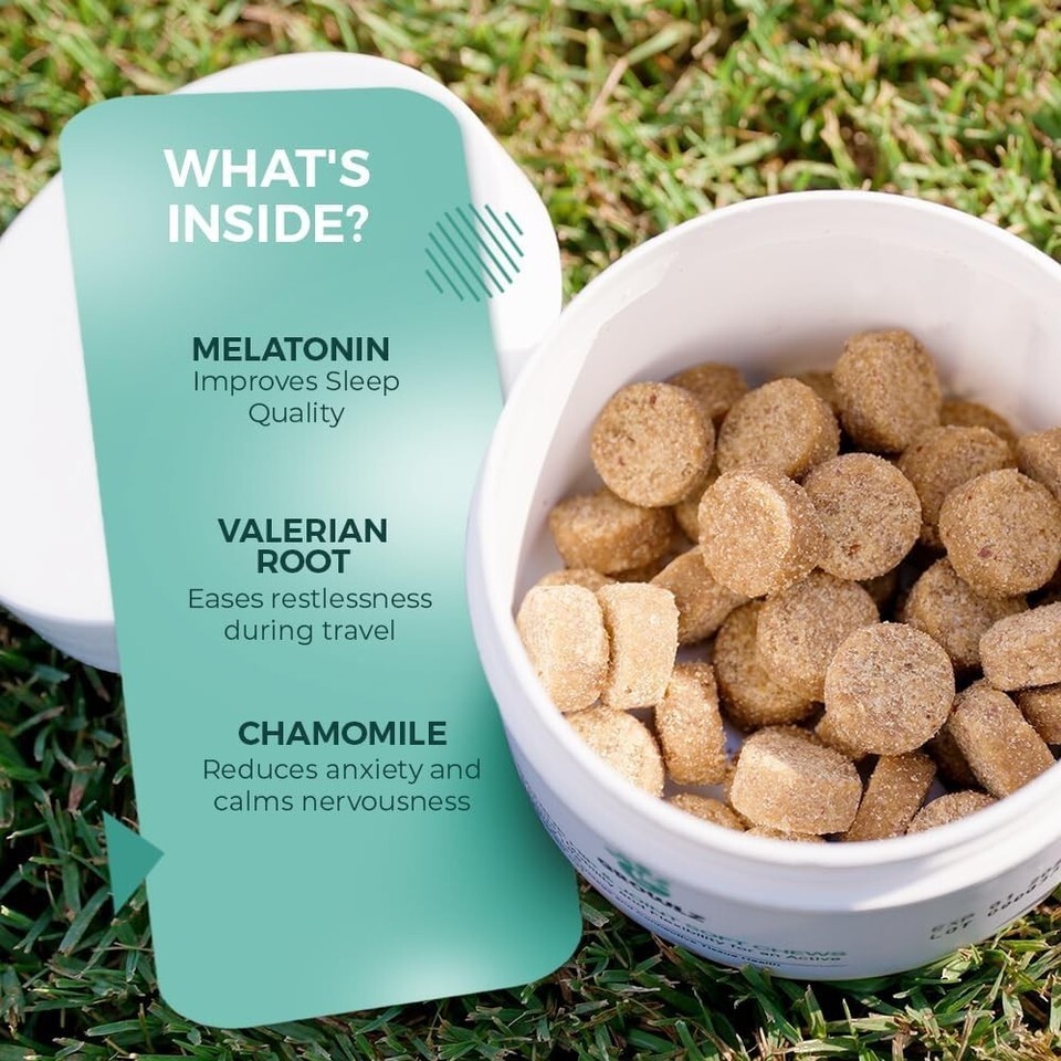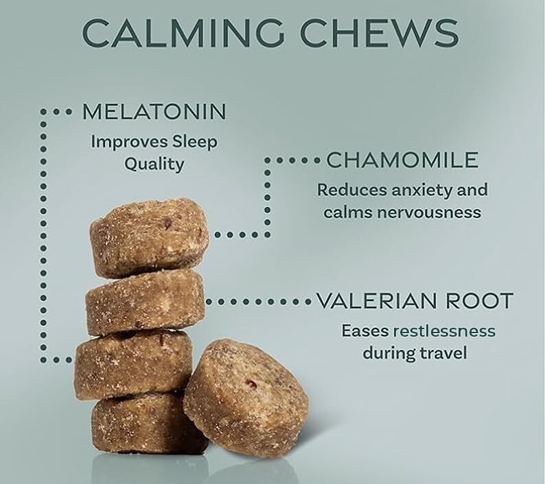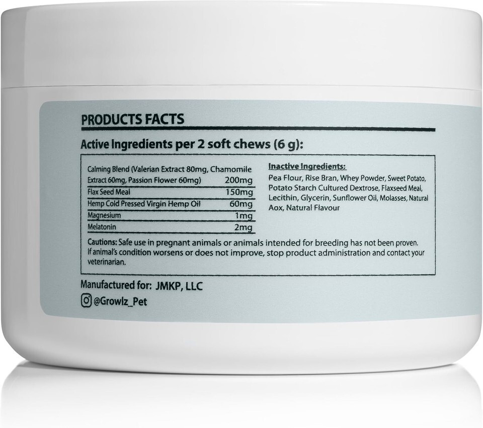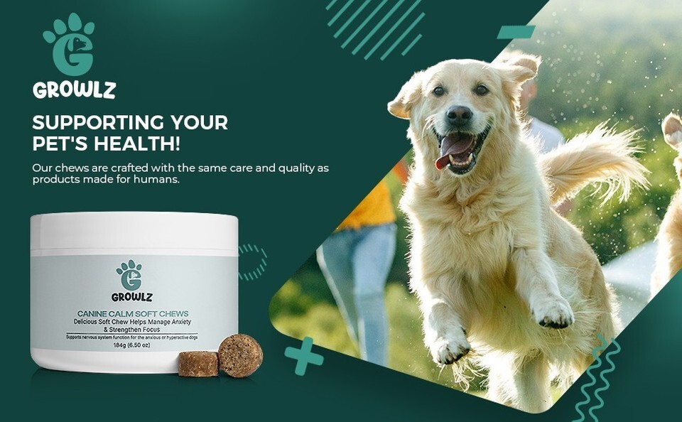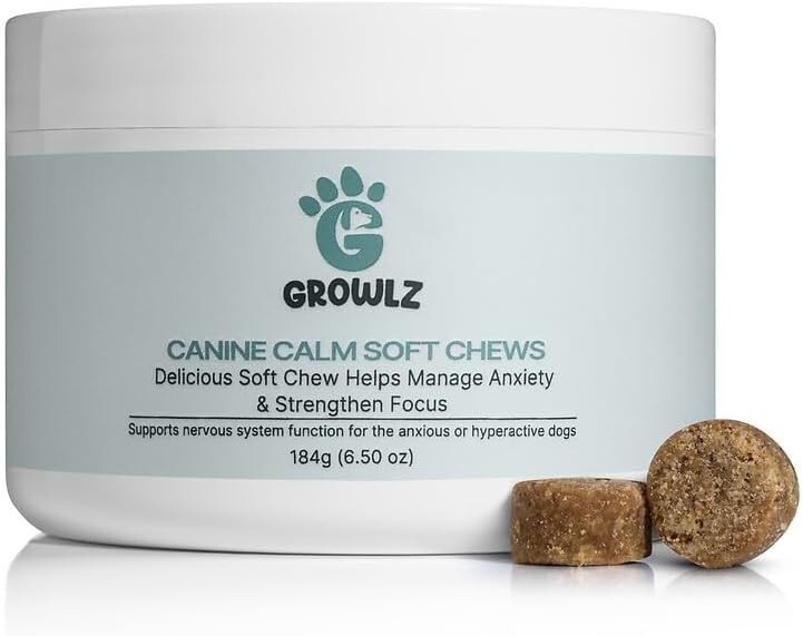 Growlz Canine Calm Soft Chews Anxiety Relief Travel Treats - K9 Soothing Soft Chews to Promote Relaxation for Crate, Sleep, Grooming - USA Made with Human Grade Ingredients 90 Count 184g/6.50 oz Exp Date 01/2026 ?REDUCES ANXIETY AND STRESS - Growlz Dog Calming Chews are the perfect solution for dogs struggling with travel stress, separation anxiety, fear of loud noises, or difficulty sleeping. Formulated with natural ingredients such as Growlz proprietary calming blend and melatonin, these chews promote relaxation and help soothe your dog's nerves in stressful situations. Whether you're taking a road trip, leaving your dog home alone, or dealing with noisy environments, Growlz calming chews can help your furry friend feel more secure and at ease. ? VETERINARY APPROVED - Growlz Dog Calming Chews offer a scientifically backed solution to help your furry friend stay calm and relaxed. Formulated with natural ingredients and approved by veterinarians, these chews are designed to reduce anxiety and stress in dogs. Whether it's loud noises, separation anxiety, or travel stress, Growlz calming chews can help your dog feel more at ease in any situation. ? HUMAN-GRADE CHEWS - Growlz chews are crafted with the same care and quality as products made for humans. Using only human-grade ingredients, we prioritize your dog's health and well-being, treating them with the same respect as any member of the family. Growlz chews are formulated to provide the highest standard, ensuring that your dog receives the best possible care. ? MADE IN THE USA - Growlz chews are a natural and delicious way to support your dog's stress and anxiety. Made with all-natural ingredients and no artificial colors or flavors, these chews are also free from corn or wheat, making them easy to digest for your furry friend. Rooted in science, Growlz formula is designed to promote calmness and reduce stress and anxiety. Growlz chews are manufactured in the USA in facilities that are GMP and SQF certified, ensuring the highest quality and safety standards.