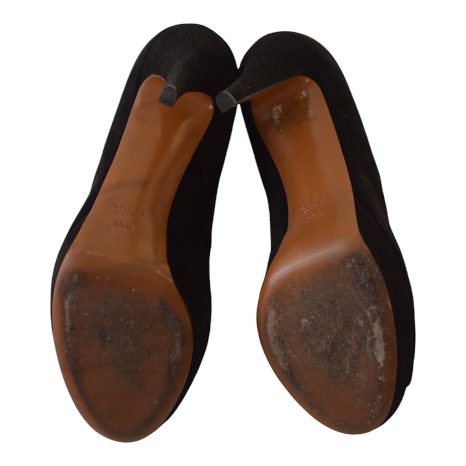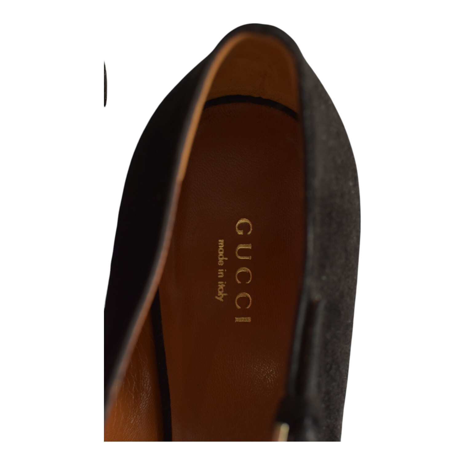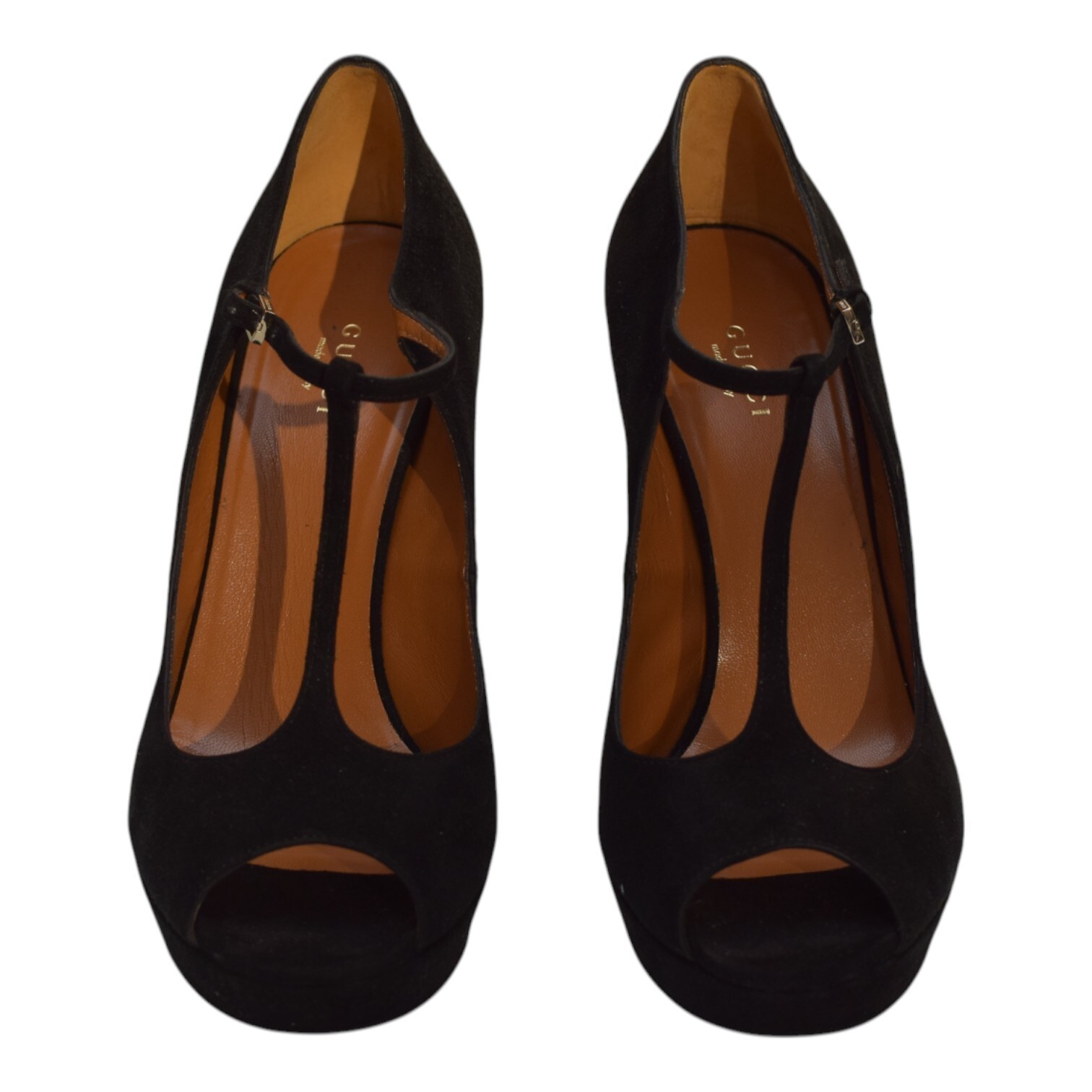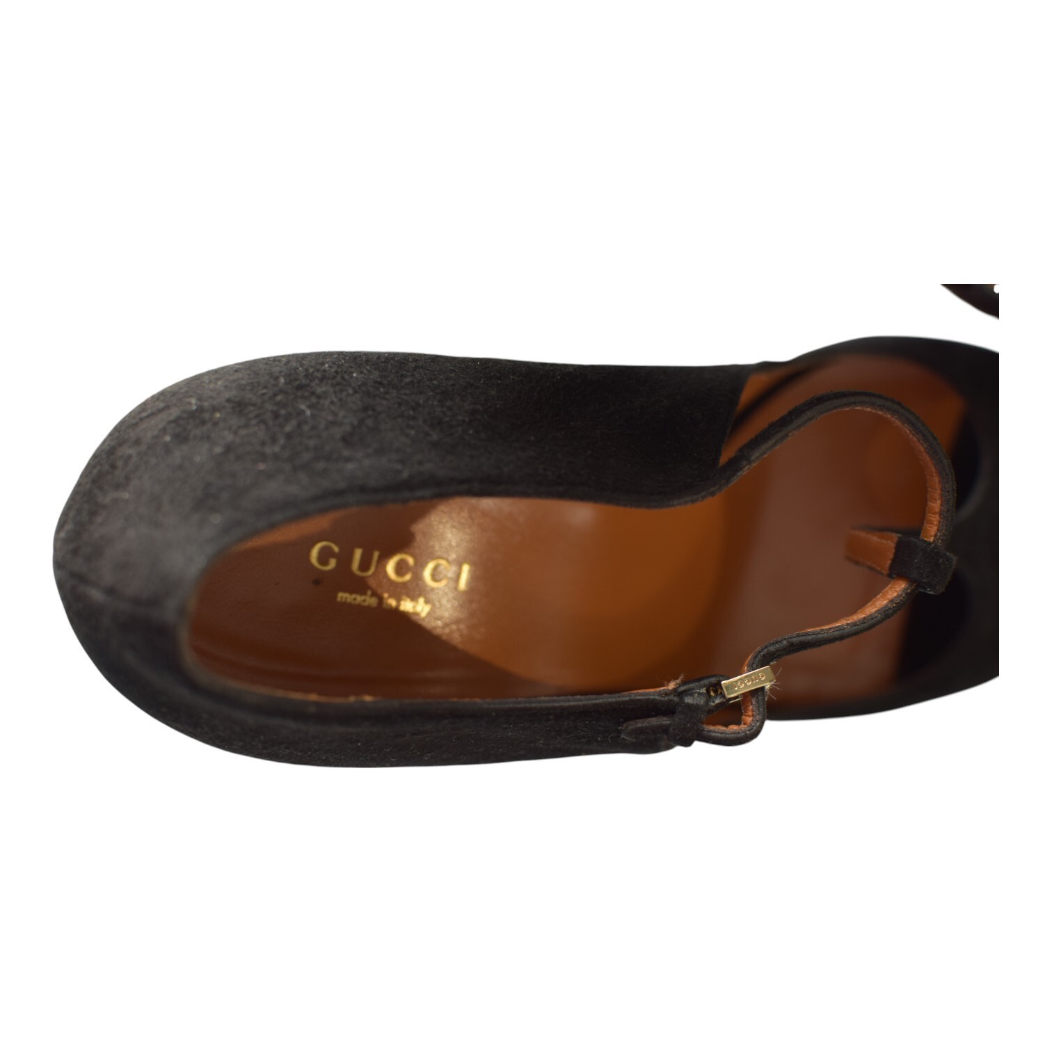 - Gucci Black Suede Leather Mary Janes Peep toe Heel Platform Pumps sz 39,5 US 9,5
