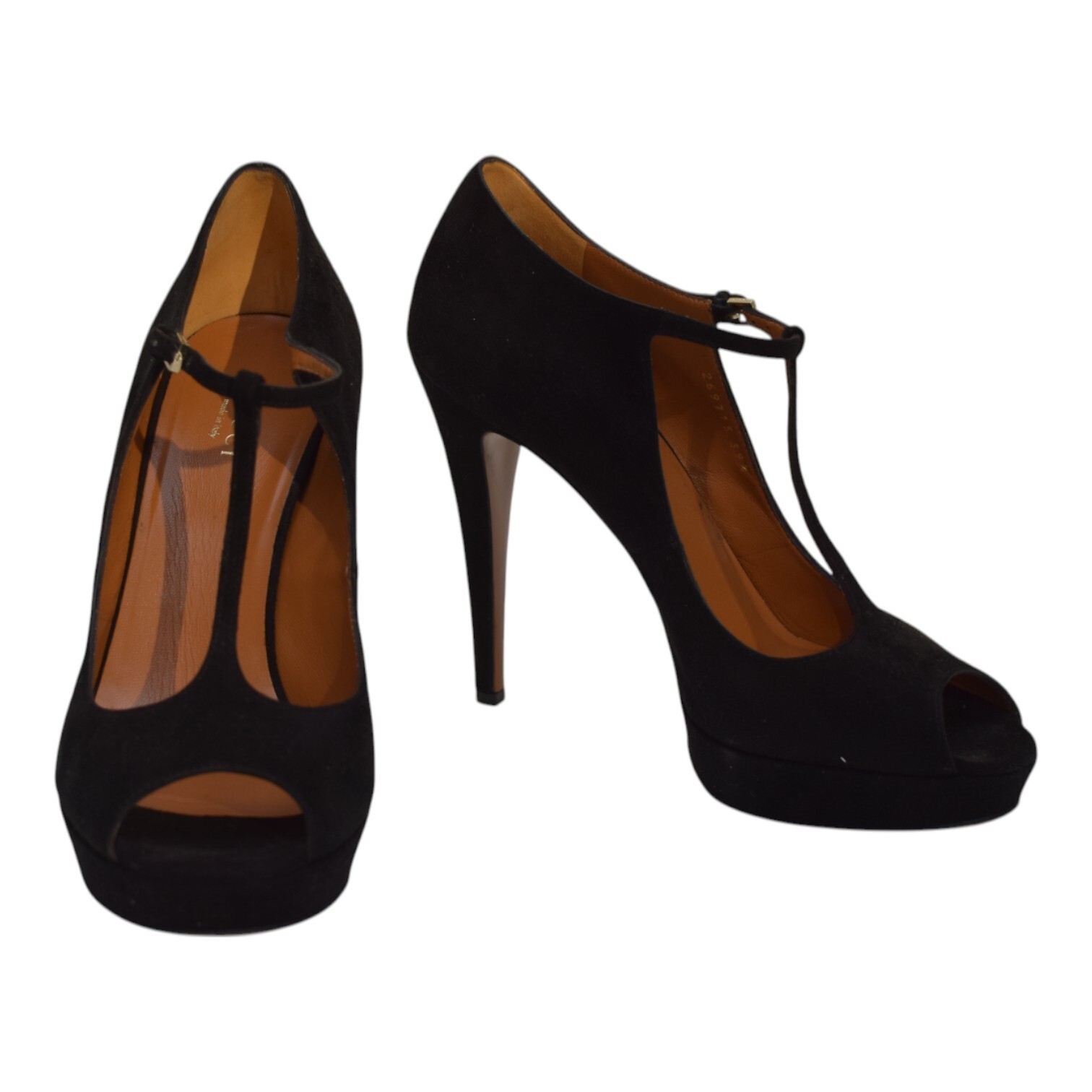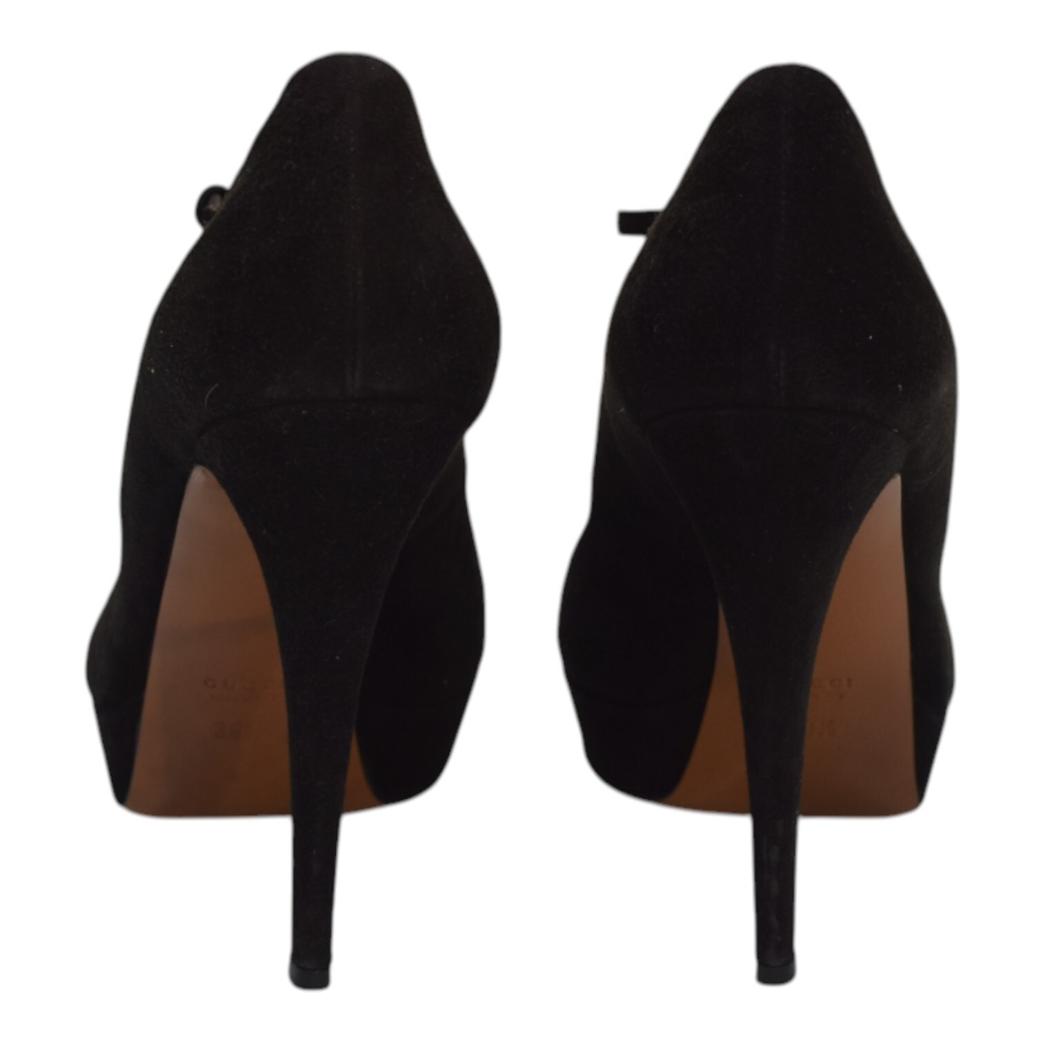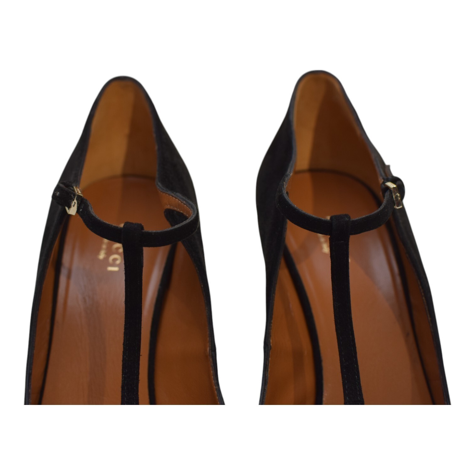 - Gucci Black Suede Leather Mary Janes Peep toe Heel Platform Pumps sz 39,5 US 9,5