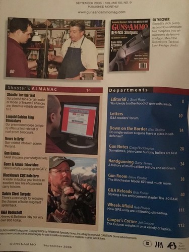 Guns Ammo Sept 2006, Defense Shotguns, Game Rifle Accuracy, Britains Brunswick muzzleloading Rifle, Colt trooper, Fox ridge outfitters encore,Reloading and Load data for the .40 S W and more. Please note magazine is in good condition, the cover has separated from binder, all other pages fully intact. 114 pages