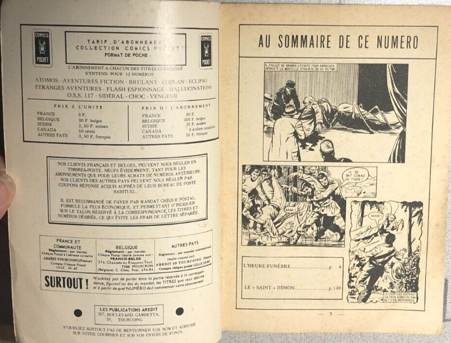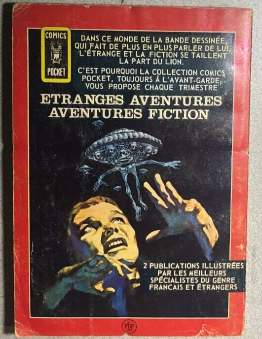 HALLUCINATIONS #22 vintage French language digest horror comic book published in France (1973) MY GRADING SYSTEM FOR COMICS I try to be fair and honest in my grading, and make every attempt to mention loose pages, stains, tears, binding damage, etc. Sometimes I find that a comic falls between two grades, in which case I will list it with a two-grade scale. NEAR MINT - MINT: I rarely use these grades, except when a comic is in truly exceptional condition. VERY FINE: very nice with virtually no major defects. FINE+: an even nicer copy, with minimal obvious defects. FINE: a nice copy, flat with minor creases; may have some spine stress, but no prominent defects. FINE-: better than VG+ but just a bit short of what I would consider Fine. VERY GOOD+: most of the comics I list fall into this grade; a typical read comic with obvious defects as noted; may have light back cover stains. VERY GOOD: fairly well-read with an accumulation of tears and defects as noted; may be heavily creased or spine-rolled; back cover stains may be present. GOOD: a complete but heavily-read comic; may be missing pieces of covers, loose covers, rolled spine or other noted damage. FAIR: a rough comic, with many defects including tears. missing pieces, water damage, spine wear, etc. POOR: no missing pages unless noted, but otherwise a pretty trashed comic; almost any and every damage may be present.