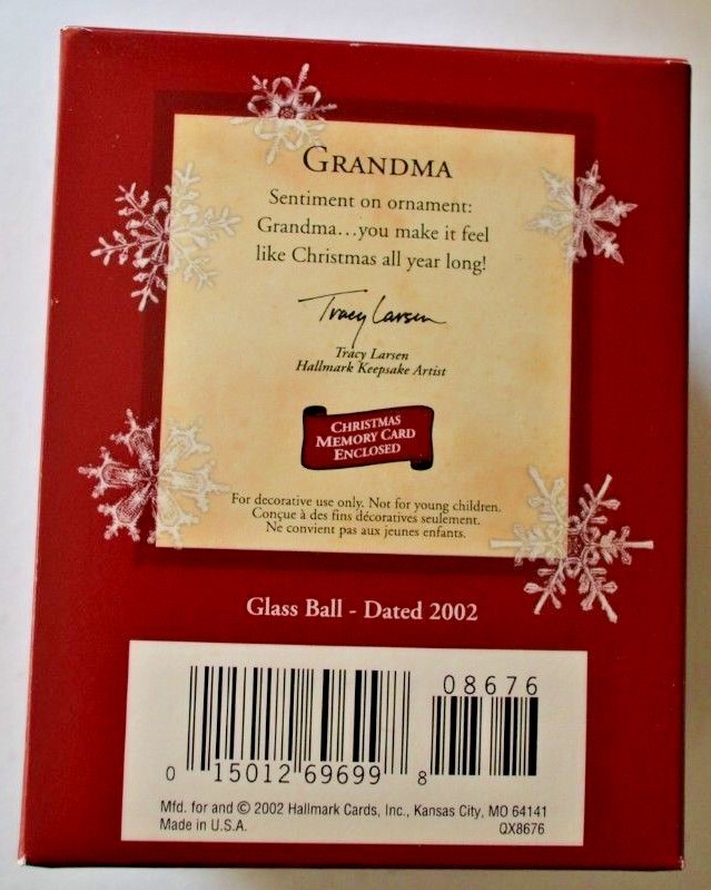 Hallmark Keepsake Ornament - Grandma QX8676 UPC 015012696998 MSRP $6.95 Unused in Box, box has slightly damaged spot where a sticker was removed Dated 2002 Size: 3 1/4 inches in Diameter Glass Artist: Tracy Larsen