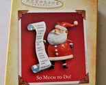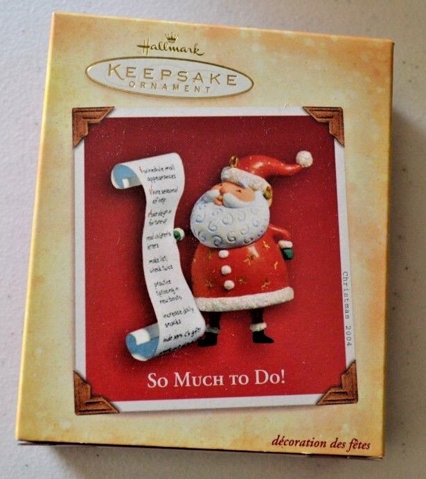Hallmark Keepsake Ornament So Much to Do! Santa Claus is checking his list MSRP $9.95 PR3035 UPC 015012822380 Dated 2004 Ornament is mint, some damage to box (sticker removal left white circle) Size: 3 inches High Artist: Nello Williams