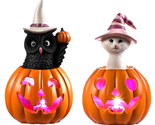 - Halloween Figurines Set of 2, Cat and Owl on Pumpkin Decor with LED Lights for H
