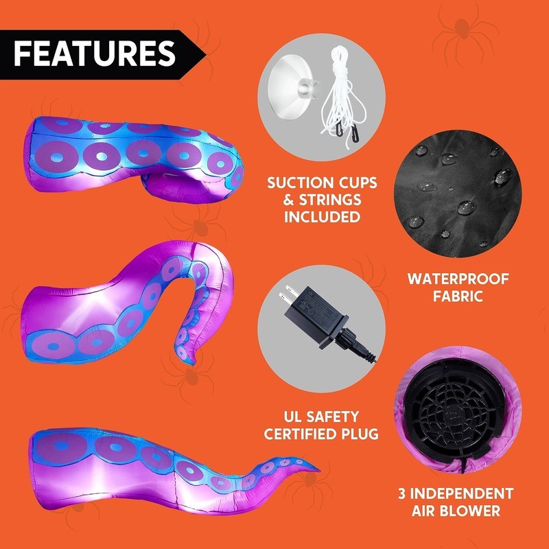 This Halloween inflatable octopus tentacle decoration has stunning visual effects, making it an unmissable centerpiece for your Halloween party.Including 4.5 ft, 5 ft, 6 ft long large tentacles.This inflatable comes with an extended cord,suction cups, fastened ropes, and a plug with UL certification. Great Function. The Halloween octopus tentacle decoration features built-in LED lights that enhance its visual effects with bright lights. It inflates and deflates easily and conveniently with the included air blower and instructions, making it durable and user-friendly. UL Certification. Our inflatable octopus tentacle decoration has passed UL certification, ensuring its safety and compliance with industry standards. We are committed to providing excellent quality and reliability in our products, giving you peace of mind. Perfect Decor. Our Halloween Blow Up Decoration is ideal for Halloween outdoor decoration, yard garden decor, Trick Or Treat event decoration and Halloween night events. Holiday blow-ups for parties and More! Ease of Use. Setting up and using this inflatable decoration is hassle-free. The inflatable octopus comes with three built-in independent air pumps that allow for quick and easy inflation. Simply plug it in, and the decoration inflates in a matter of minutes. The compact size and lightweight design make it easy to store and transport, ensuring convenience and ease of use.