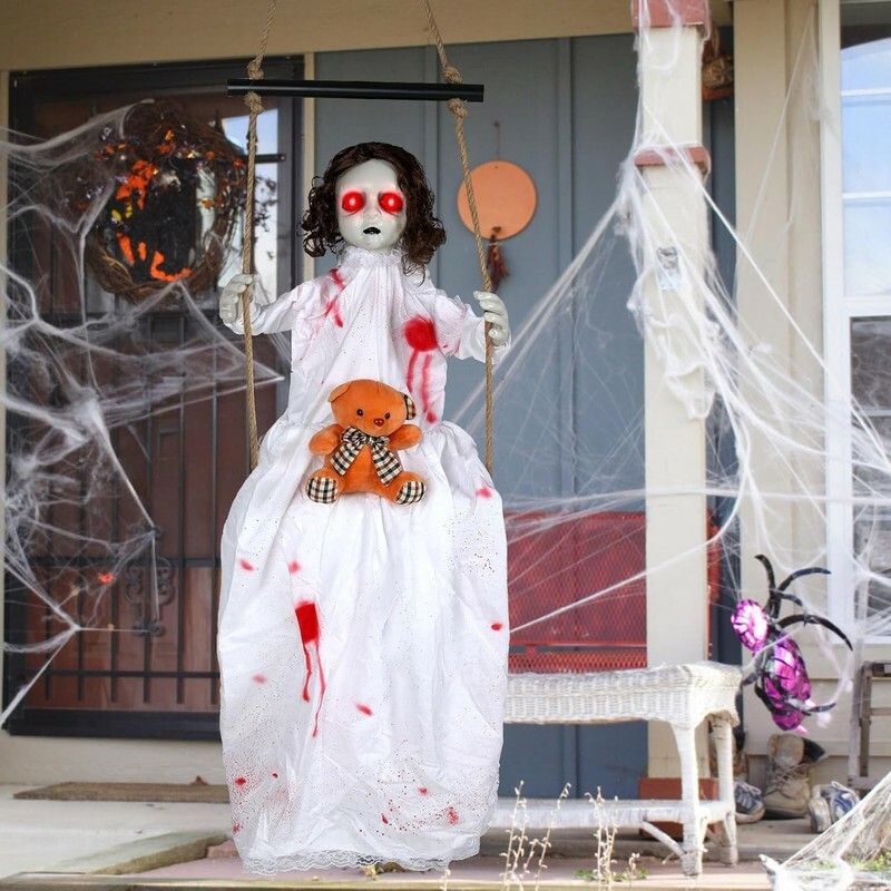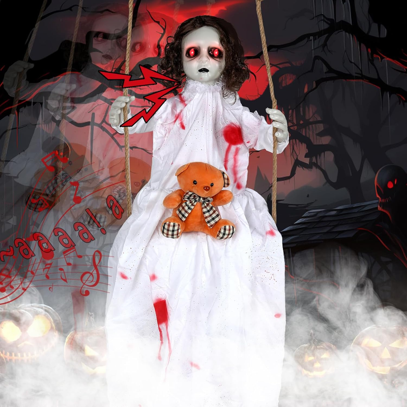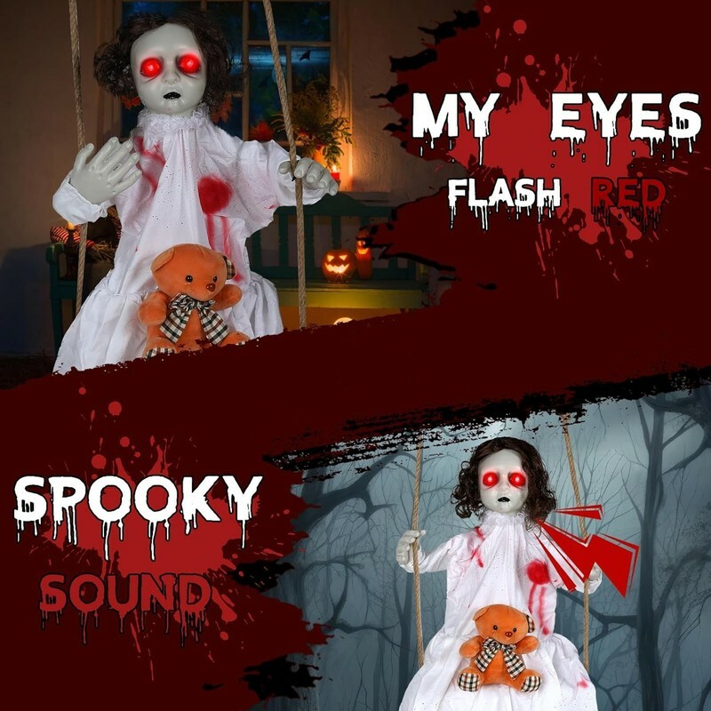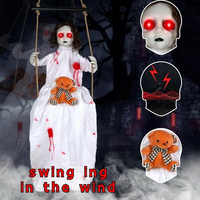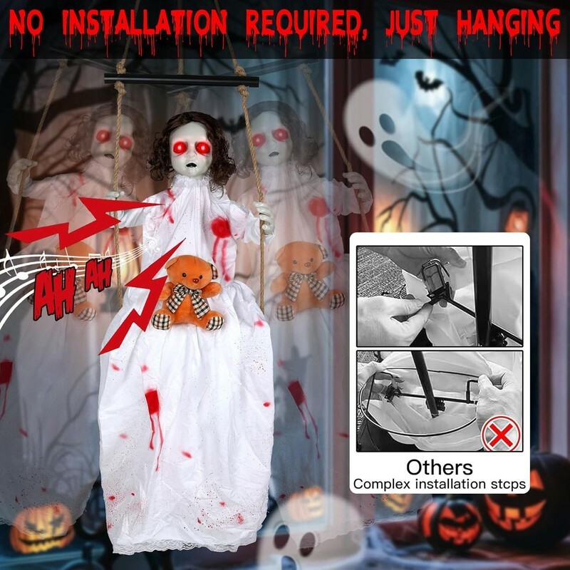 [ Halloween Horror Doll ] - Our Halloween swinging girl with light up eyes and scary sounds, whether indoors or outdoors, can be perfectly spooky and unsettling, adding a tense and scary atmosphere to your Halloween night.