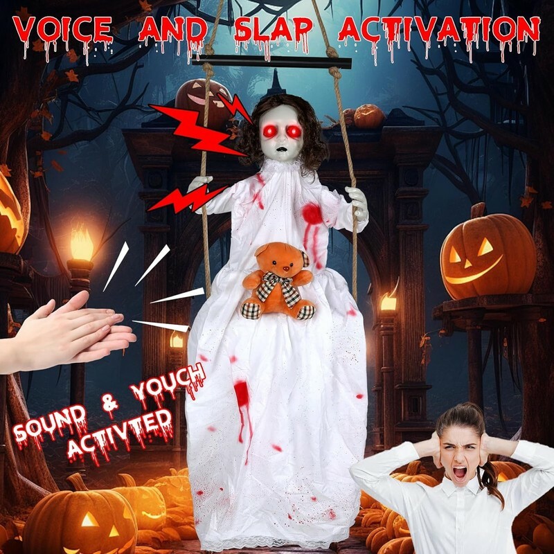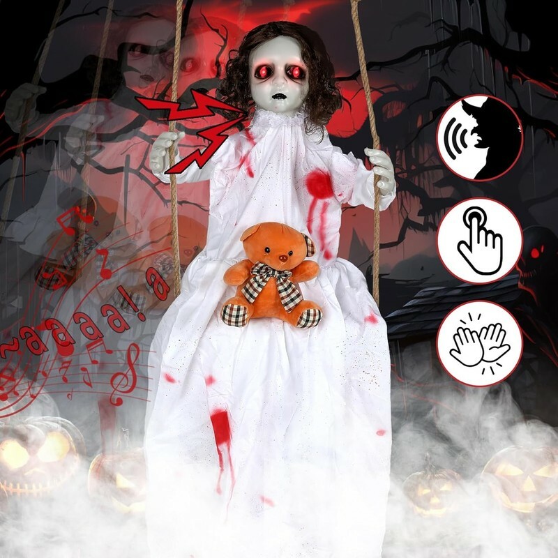 - Halloween Outdoor Tree Decorations, Hanging Swinging Doll Girl with Sound & Slap