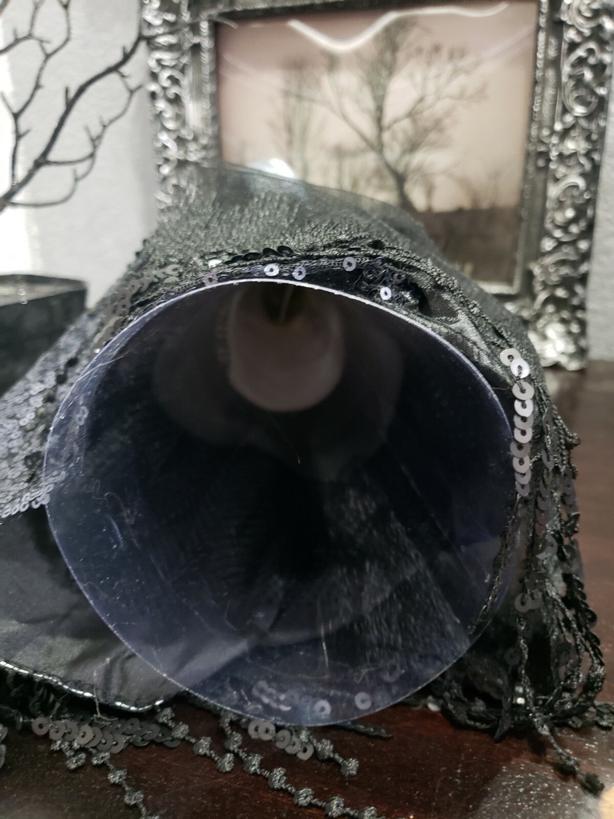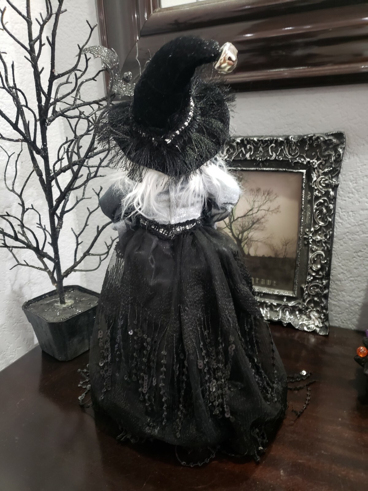 Up for sale we have this beautiful witch shelf sitter for your Halloween decor. She is so puuuurty! She is wearing a lovely black sequins dress with black lace and a velvet witch hat with a bell at the end of her hat. She aslo has her lovely white hair and holding her crystal ball in one hand and has a watch dangling from her dress. She is approx 17" tall from the bottom to the tip of her witch hat . She will look amazing in your decor! She is new.