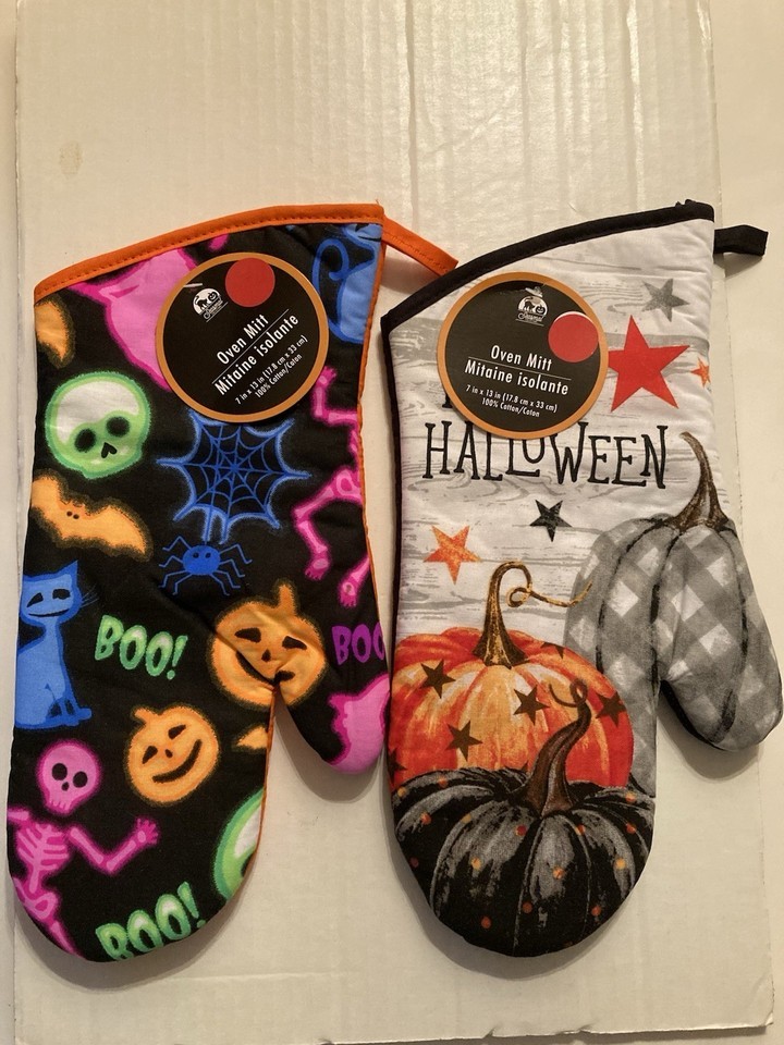 - Halloween kitchen 2 pc set oven mitt skeleton cat bat web spider pumpkins