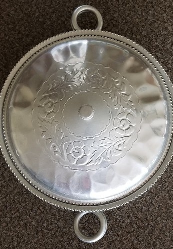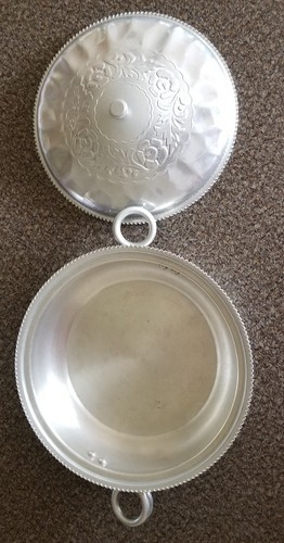 Hammered aluminum covered candy dish This dish is shiny and has curled handles As with all the 1950s aluminum, because of age and softness of metal, there are some scratches marks on the surface Dish measures approximately 9.5" from handle to handle Inside of dish measures approximately 6" diameter This item is in very good ~ pre-owned condition Please view photos for a good description of this item Thank you!