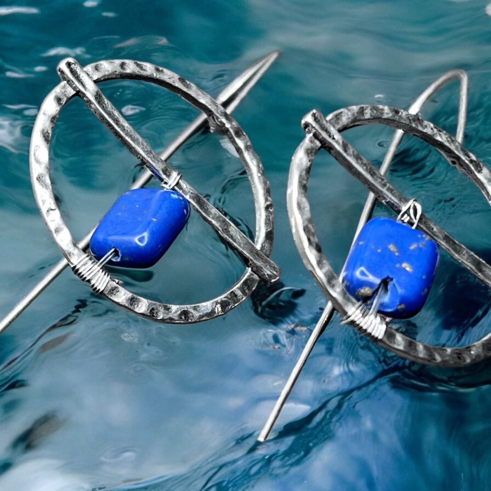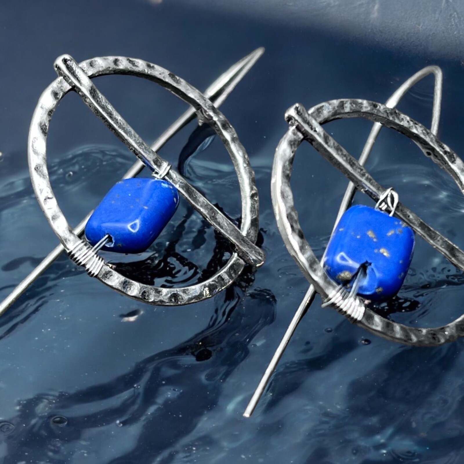 Add a unique, handcrafted vibe to your style with these hammered silver-tone drop earrings, featuring striking blue stone accents. Lightweight yet bold, these earrings are perfect for everyday wear, boho fashion, or as a thoughtful gift.